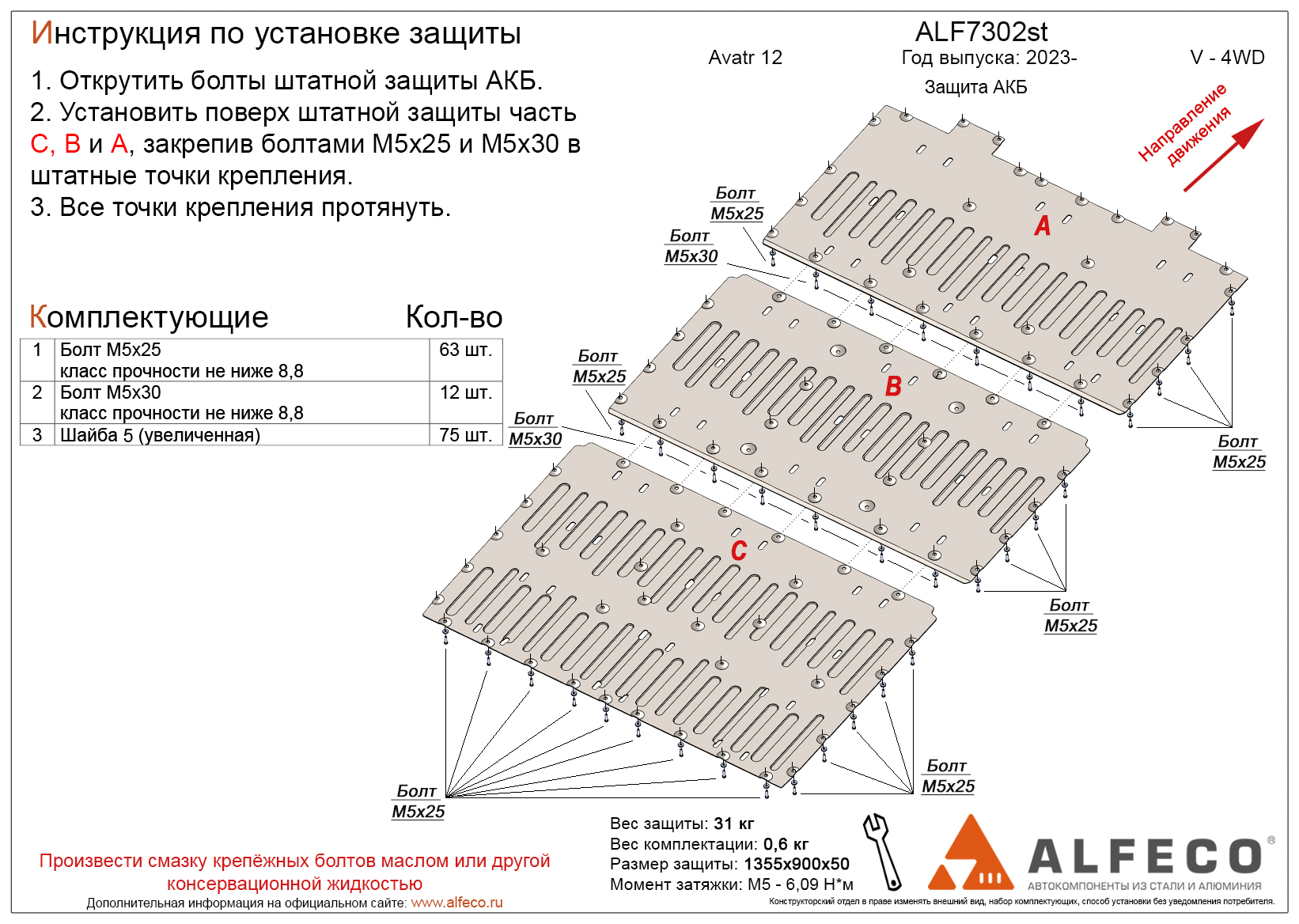 Защита АКБ ALFeco арт. ALF7302al изготовлена из алюминия толщиной 3 мм специально для автомобиля Avatr 12 2023-. Обеспечивает надежную защиту агрегатов от механических повреждений и попадания дорожной грязи и других предметов, встречающихся на проезжей части, способных зачастую нанести серьезный вред автомобилю. В комплекте идет весь необходимый крепеж для установки. Наличие можно уточнить по телефону. Возможна установка в нашем автосервисе по предварительной записи