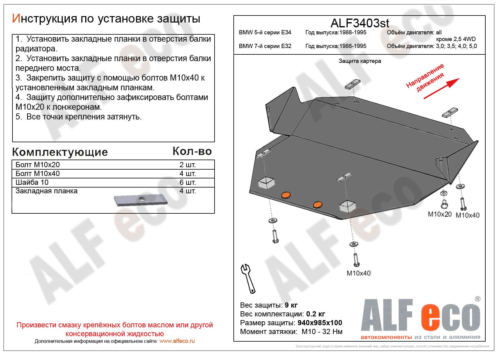 Защита картера ALFeco арт. ALF3403al-1 изготовлена из алюминия толщиной 4мм специально для автомобиля BMW 7-й серии E32 1986-1995. Обеспечивает надежную защиту агрегатов от механических повреждений и попадания дорожной грязи и других предметов, встречающихся на проезжей части, способных зачастую нанести серьезный вред автомобилю. В комплекте идет весь необходимый крепеж для установки. Наличие можно уточнить по телефону. Возможна установка в нашем автосервисе по предварительной записи