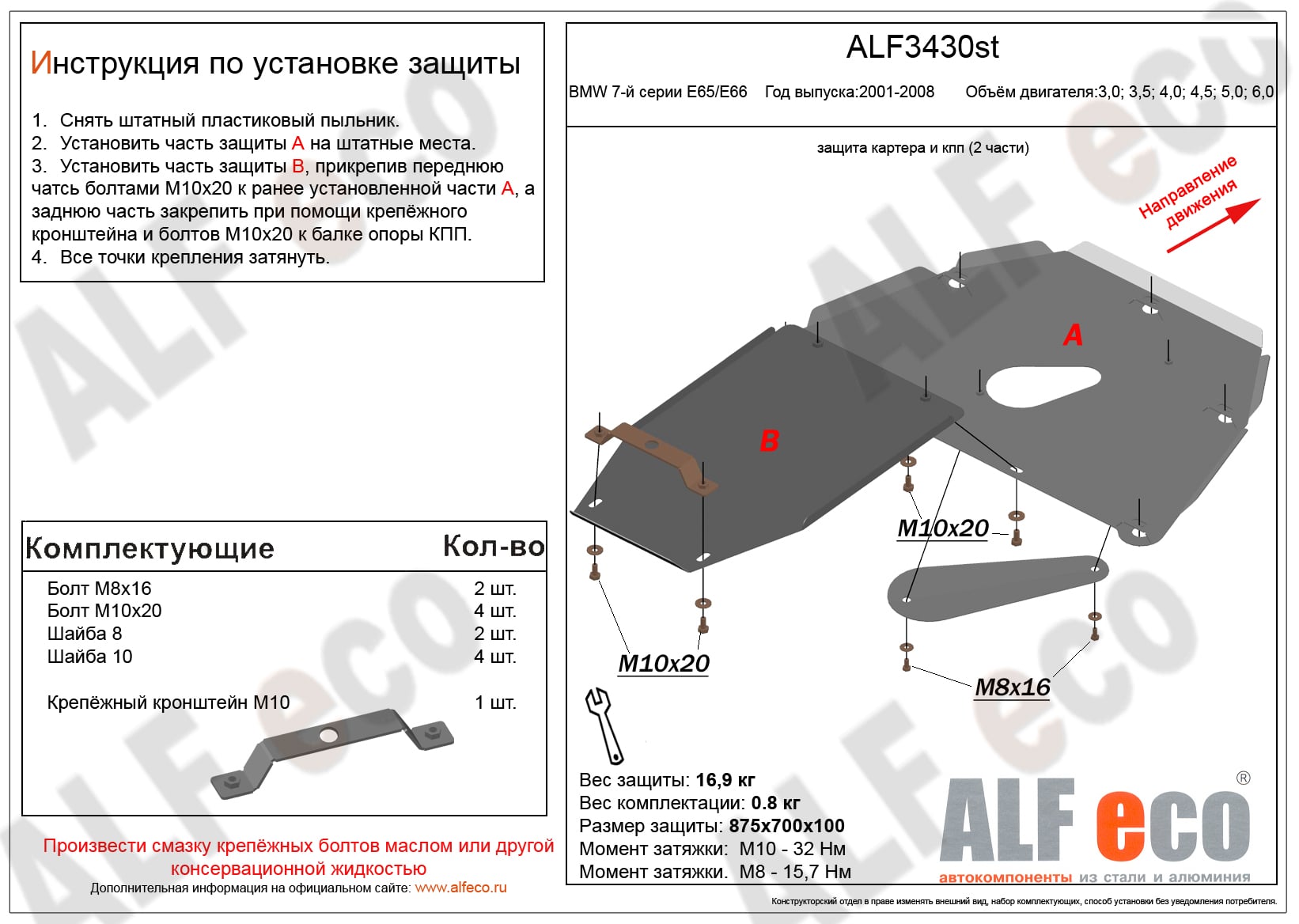 Защита картера и КПП (2 части) ALFeco арт. ALF3430st изготовлена из стали толщиной 2мм специально для автомобиля BMW 7-й серии E65/E66 2001-2008. Обеспечивает надежную защиту агрегатов от механических повреждений и попадания дорожной грязи и других предметов, встречающихся на проезжей части, способных зачастую нанести серьезный вред автомобилю. В комплекте идет весь необходимый крепеж для установки. Наличие можно уточнить по телефону. Возможна установка в нашем автосервисе по предварительной записи