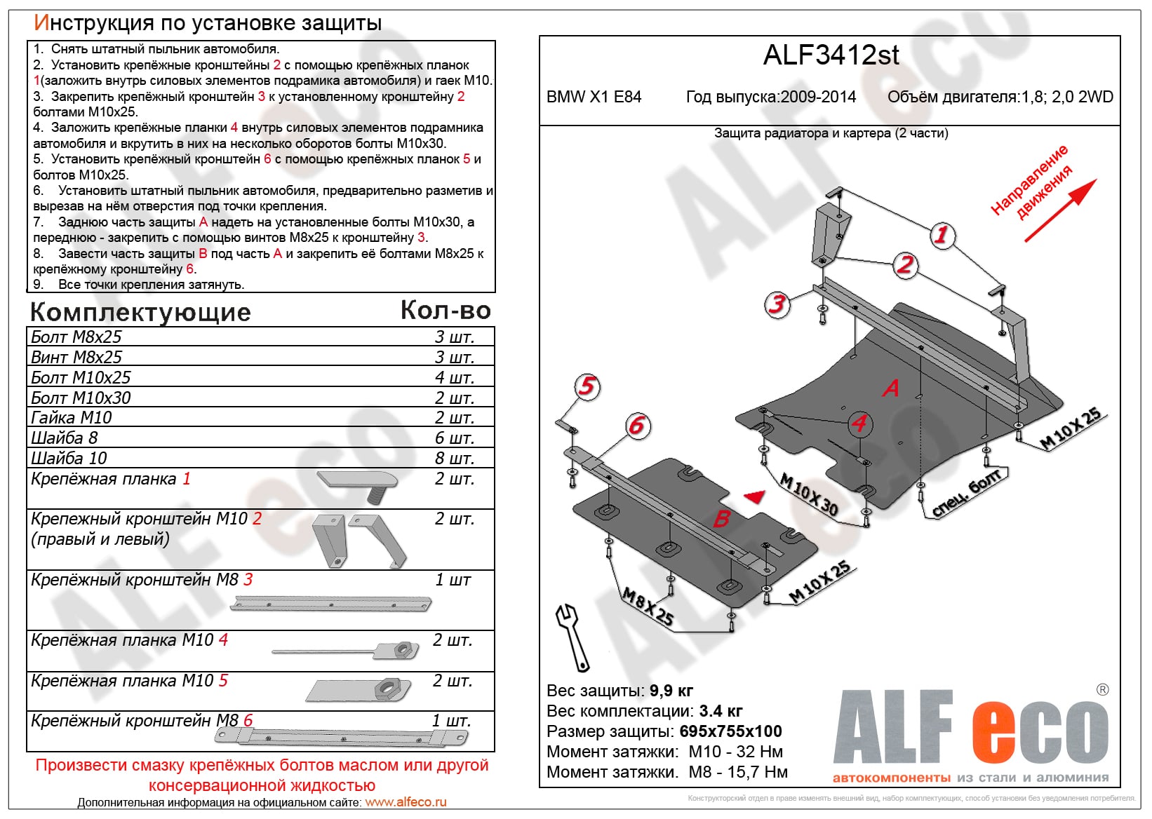 Защита радиатора и картера (2 части) ALFeco арт. ALF3412al изготовлена из алюминия толщиной 4мм специально для автомобиля BMW Х1 E84 2009-2014. Обеспечивает надежную защиту агрегатов от механических повреждений и попадания дорожной грязи и других предметов, встречающихся на проезжей части, способных зачастую нанести серьезный вред автомобилю.