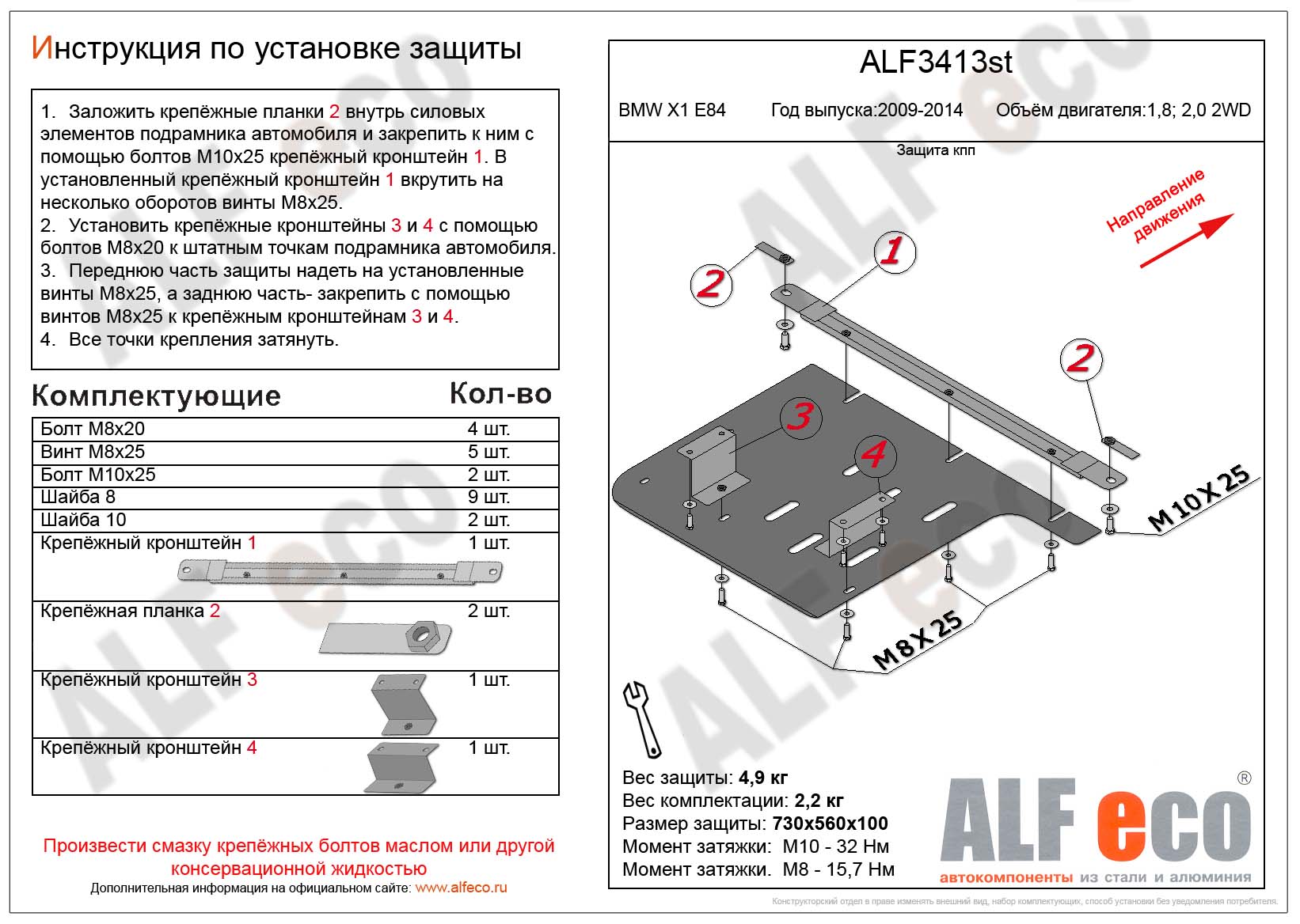 Защита КПП ALFeco арт. ALF3413al изготовлена из алюминия толщиной 4мм специально для автомобиля BMW Х1 E84 2009-2014. Обеспечивает надежную защиту агрегатов от механических повреждений и попадания дорожной грязи и других предметов, встречающихся на проезжей части, способных зачастую нанести серьезный вред автомобилю.