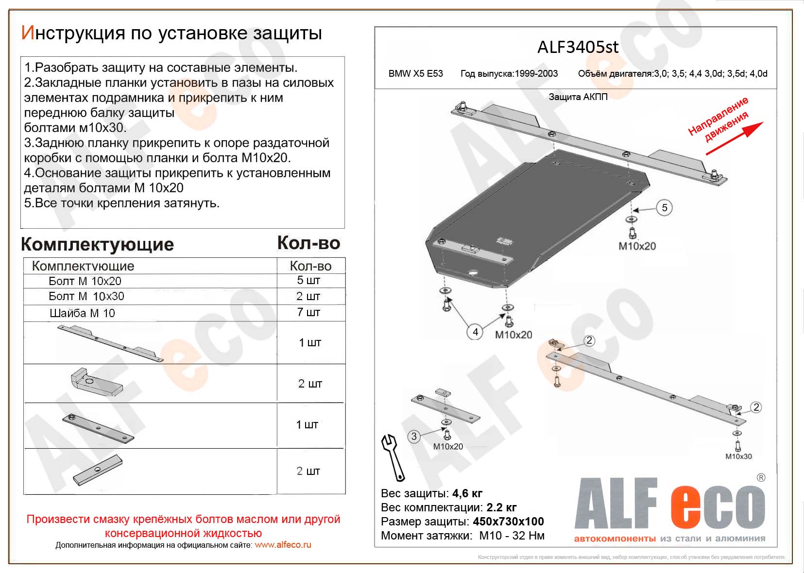 Защита АКПП ALFeco арт. ALF3405al изготовлена из алюминия толщиной 4мм специально для автомобиля BMW Х5 E53 1999-2003. Обеспечивает надежную защиту агрегатов от механических повреждений и попадания дорожной грязи и других предметов, встречающихся на проезжей части, способных зачастую нанести серьезный вред автомобилю. В комплекте идет весь необходимый крепеж для установки. Наличие можно уточнить по телефону. Возможна установка в нашем автосервисе по предварительной записи