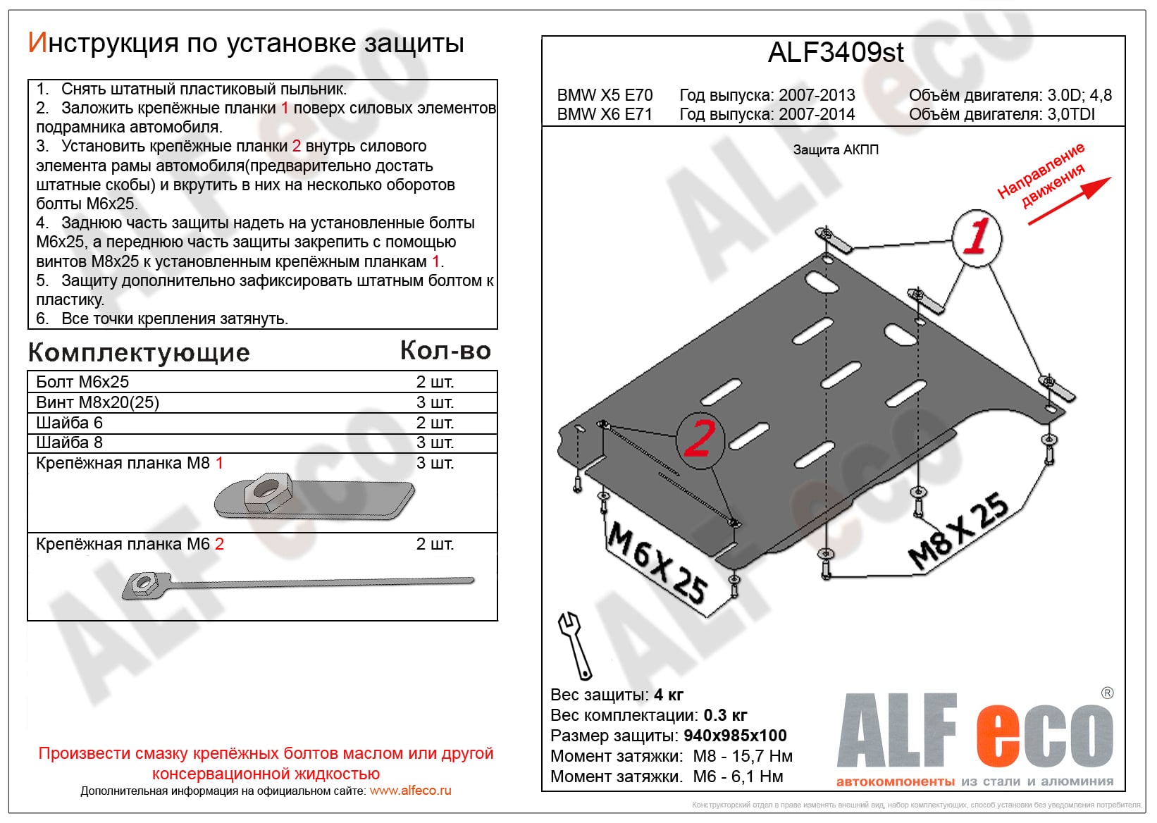 Защита АКПП BMW Х5 E70 2007-2013 3.0D; 4,8 защита АКПП V- 3.0D; 4,8 , ALFeco, алюминий 4мм, арт. ALF3409al