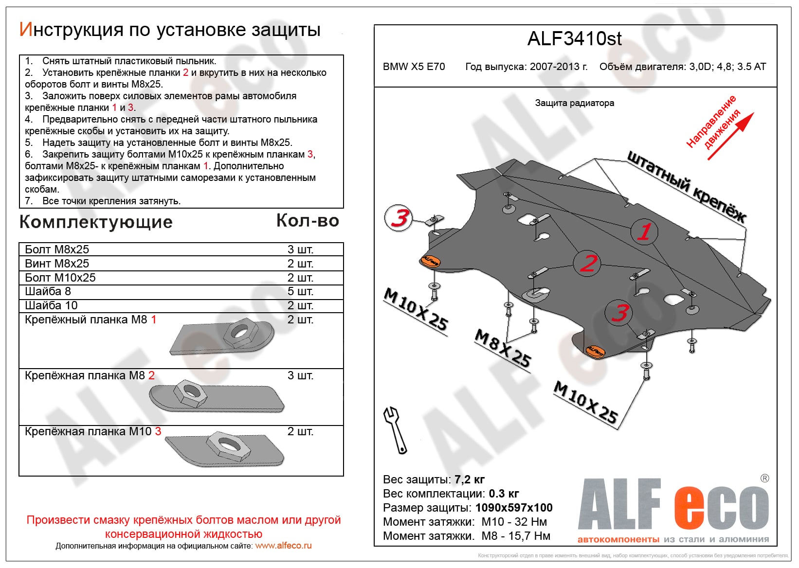 Защита  радиатора BMW Х5 E70 2007-2013 V-3,0D; 4,8; 3.5 AT , ALFeco, алюминий 4мм, арт. ALF3410al