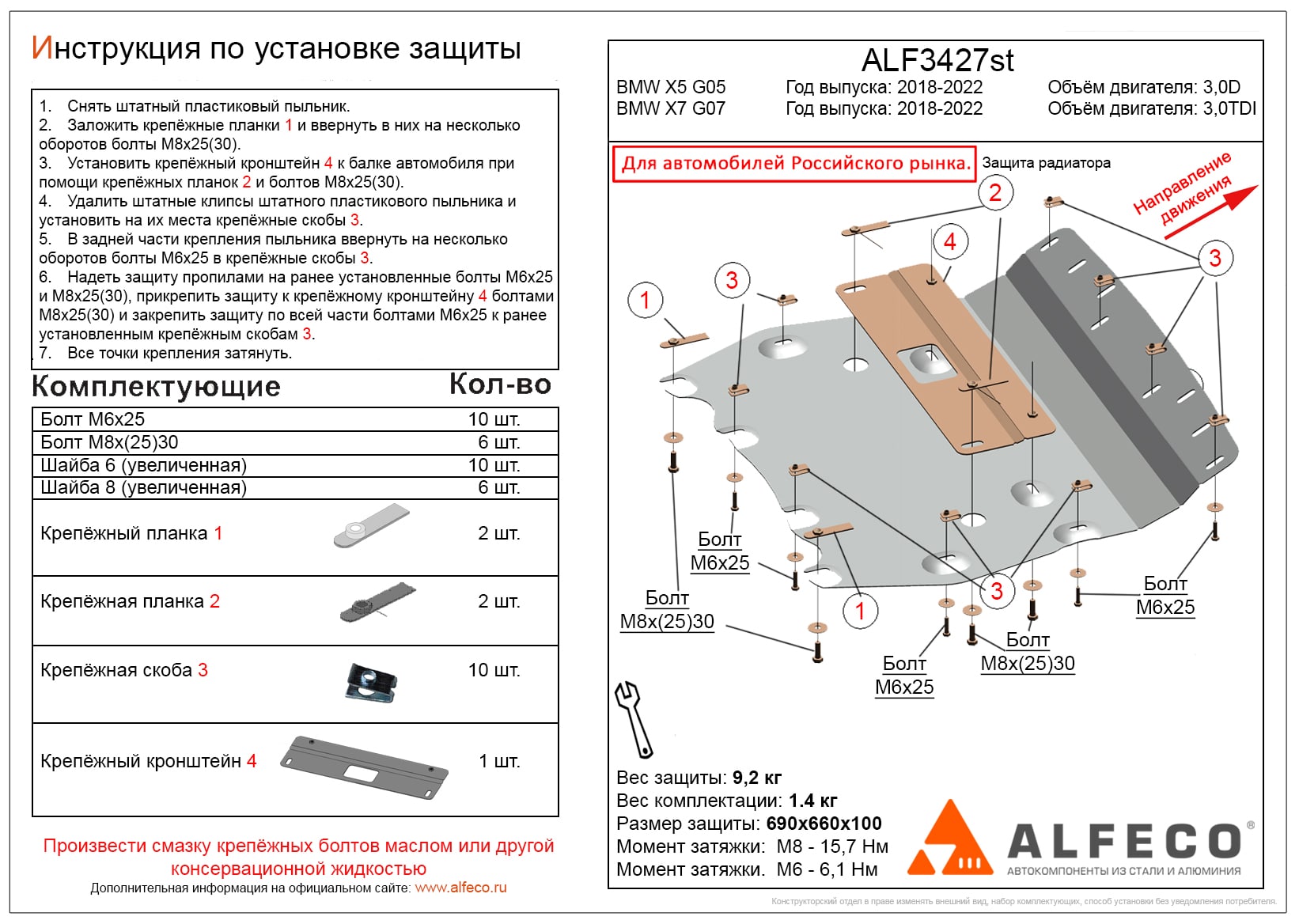 Защита радиатора ALFeco арт. ALF3427al-1 изготовлена из алюминия толщиной 4мм специально для автомобиля BMW Х7 G07 2018-2022. Обеспечивает надежную защиту агрегатов от механических повреждений и попадания дорожной грязи и других предметов, встречающихся на проезжей части, способных зачастую нанести серьезный вред автомобилю. В комплекте идет весь необходимый крепеж для установки. Наличие можно уточнить по телефону. Возможна установка в нашем автосервисе по предварительной записи