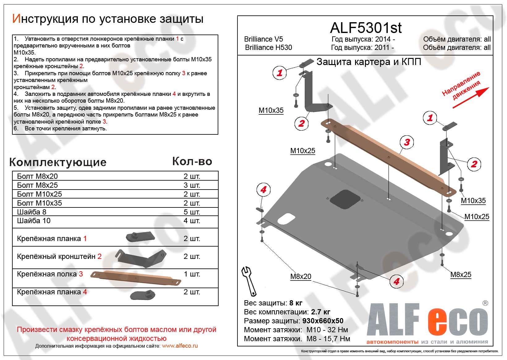 Защита картера и КПП ALFeco арт. ALF5301st-1 изготовлена из стали толщиной 2мм специально для автомобиля Brilliance V5 2011-2019. Обеспечивает надежную защиту агрегатов от механических повреждений и попадания дорожной грязи и других предметов, встречающихся на проезжей части, способных зачастую нанести серьезный вред автомобилю. В комплекте идет весь необходимый крепеж для установки. Наличие можно уточнить по телефону. Возможна установка в нашем автосервисе по предварительной записи