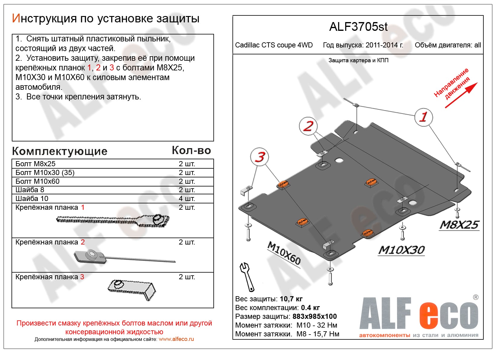 Защита картера и КПП ALFeco арт. ALF3705st изготовлена из стали толщиной 2мм специально для автомобиля Cadillac CTS coupe 4WD 2011-2014. Обеспечивает надежную защиту агрегатов от механических повреждений и попадания дорожной грязи и других предметов, встречающихся на проезжей части, способных зачастую нанести серьезный вред автомобилю. В комплекте идет весь необходимый крепеж для установки. Наличие можно уточнить по телефону. Возможна установка в нашем автосервисе по предварительной записи