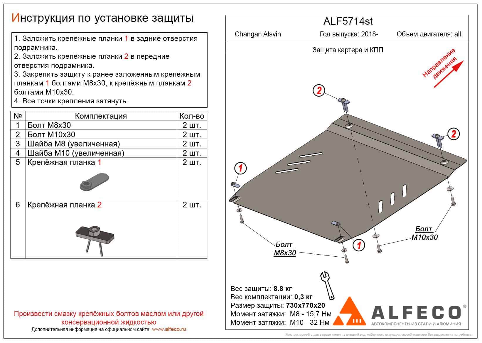 Защита картера и КПП ALFeco арт. ALF5714al изготовлена из алюминия толщиной 4мм специально для автомобиля Changan Alsvin 2018-. Обеспечивает надежную защиту агрегатов от механических повреждений и попадания дорожной грязи и других предметов, встречающихся на проезжей части, способных зачастую нанести серьезный вред автомобилю. В комплекте идет весь необходимый крепеж для установки. Наличие можно уточнить по телефону. Возможна установка в нашем автосервисе по предварительной записи