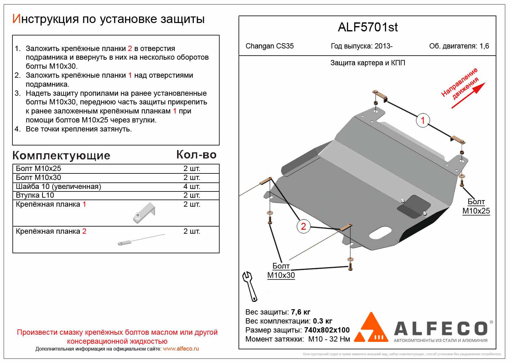 Защита картера и КПП ALFeco арт. ALF5701st изготовлена из стали толщиной 2мм специально для автомобиля Changan CS35 2013-2020. Обеспечивает надежную защиту агрегатов от механических повреждений и попадания дорожной грязи и других предметов, встречающихся на проезжей части, способных зачастую нанести серьезный вред автомобилю. В комплекте идет весь необходимый крепеж для установки. Наличие можно уточнить по телефону. Возможна установка в нашем автосервисе по предварительной записи