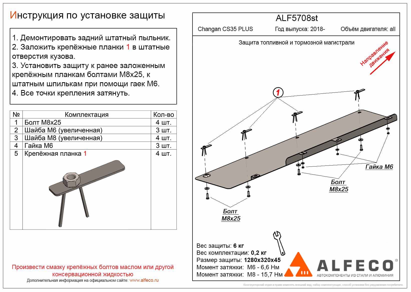 Защита топливной и тормозной магистрали ALFeco арт. ALF5708st изготовлена из стали толщиной 2мм специально для автомобиля Changan CS35 PLUS 2018-. Обеспечивает надежную защиту агрегатов от механических повреждений и попадания дорожной грязи и других предметов, встречающихся на проезжей части, способных зачастую нанести серьезный вред автомобилю. В комплекте идет весь необходимый крепеж для установки. Наличие можно уточнить по телефону. Возможна установка в нашем автосервисе по предварительной записи