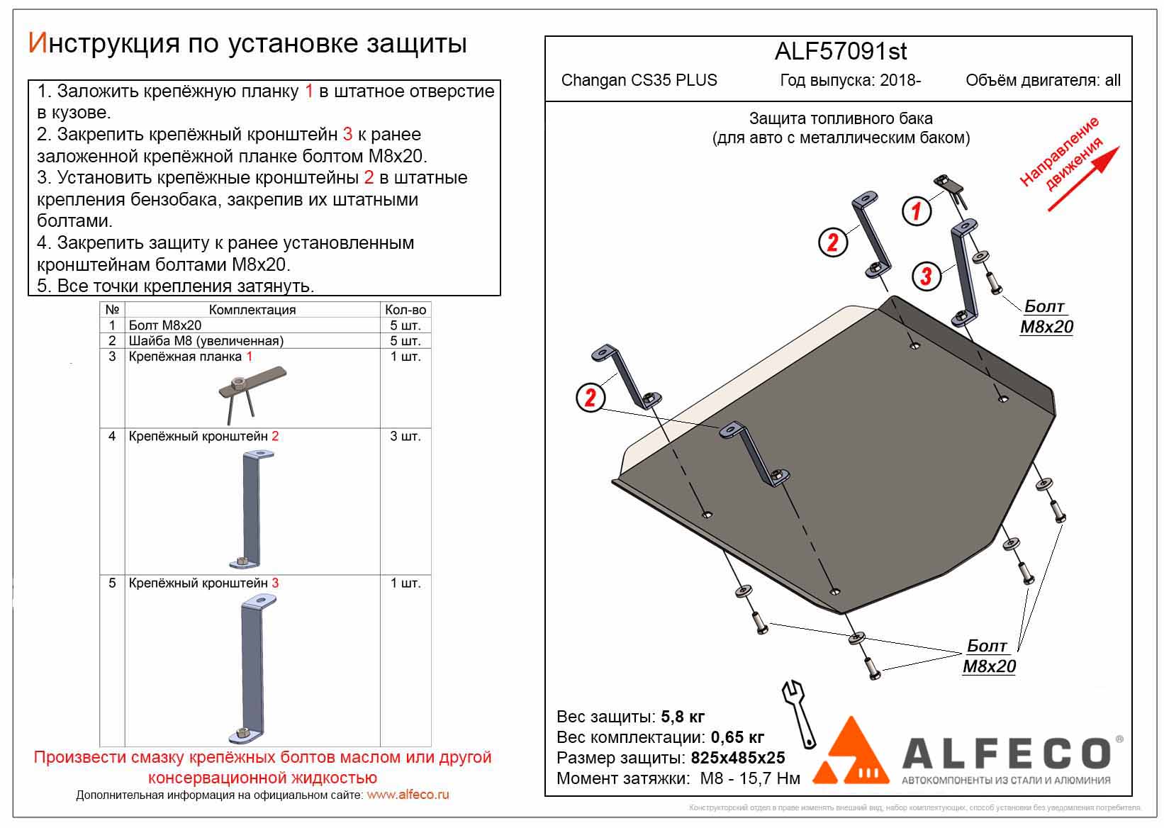 Защита топливного бака (для авто с металлическим баком) ALFeco арт. ALF57091st изготовлена из стали толщиной 2мм специально для автомобиля Changan CS35 PLUS 2018-. Обеспечивает надежную защиту агрегатов от механических повреждений и попадания дорожной грязи и других предметов, встречающихся на проезжей части, способных зачастую нанести серьезный вред автомобилю. В комплекте идет весь необходимый крепеж для установки. Наличие можно уточнить по телефону. Возможна установка в нашем автосервисе по предварительной записи