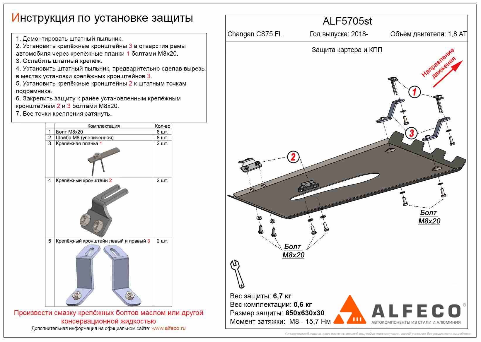 Защита картера и КПП ALFeco арт. ALF5705al изготовлена из алюминия толщиной 4мм специально для автомобиля Changan CS75 FL 2018-. Обеспечивает надежную защиту агрегатов от механических повреждений и попадания дорожной грязи и других предметов, встречающихся на проезжей части, способных зачастую нанести серьезный вред автомобилю. В комплекте идет весь необходимый крепеж для установки. Наличие можно уточнить по телефону. Возможна установка в нашем автосервисе по предварительной записи