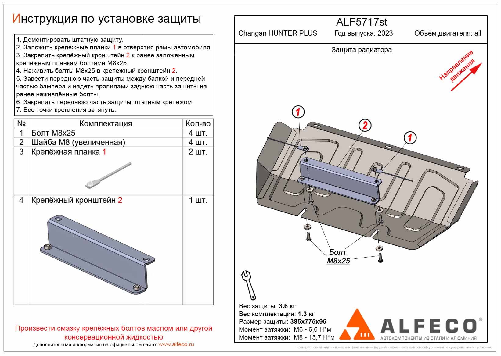 Защита радиатора ALFeco арт. ALF5717al изготовлена из алюминия толщиной 4мм специально для автомобиля Changan HUNTER PLUS 2023-. Обеспечивает надежную защиту агрегатов от механических повреждений и попадания дорожной грязи и других предметов, встречающихся на проезжей части, способных зачастую нанести серьезный вред автомобилю. В комплекте идет весь необходимый крепеж для установки. Наличие можно уточнить по телефону. Возможна установка в нашем автосервисе по предварительной записи