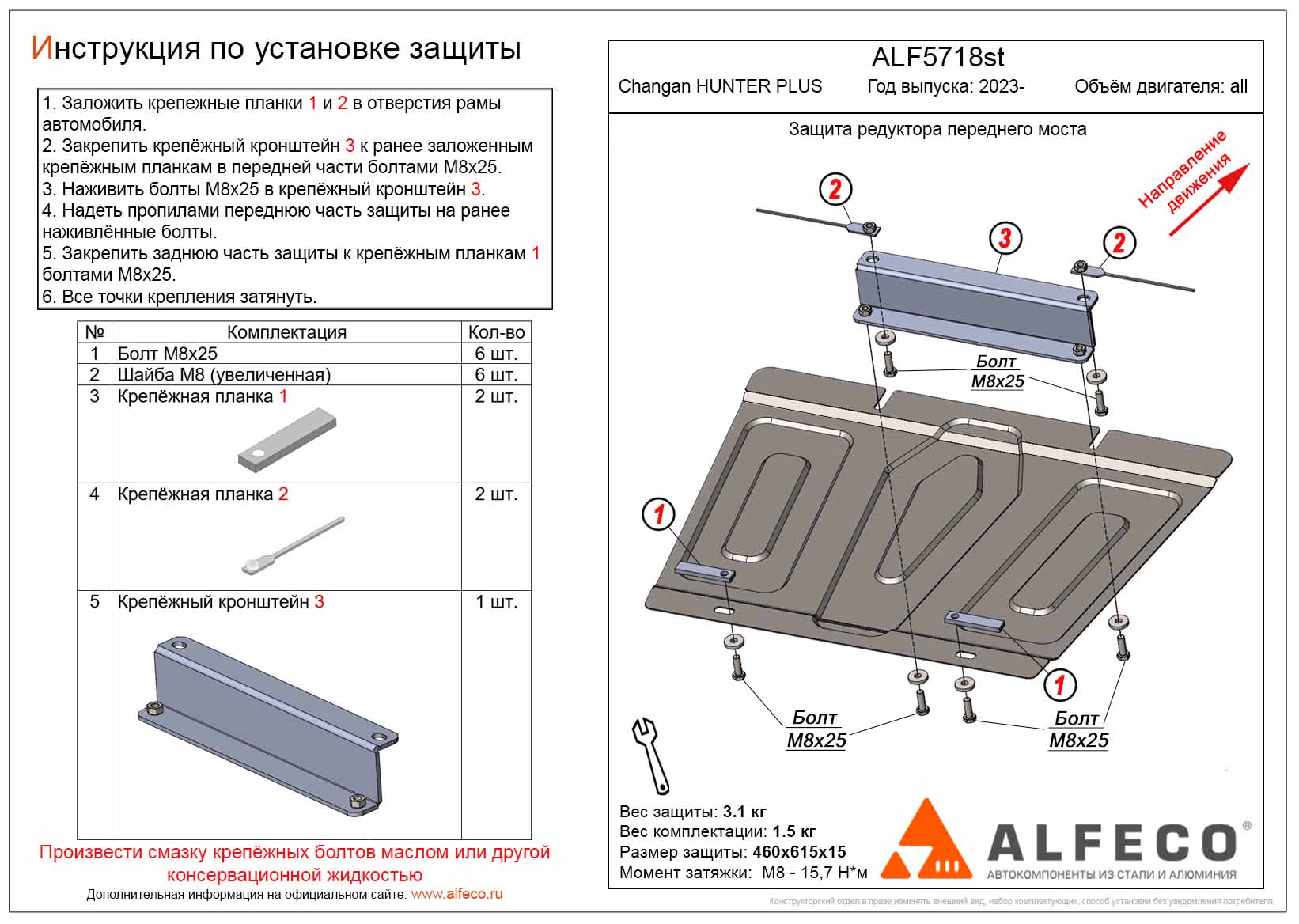 Защита редуктора переднего моста ALFeco арт. ALF5718al изготовлена из алюминия толщиной 4мм специально для автомобиля Changan HUNTER PLUS 2023-. Обеспечивает надежную защиту агрегатов от механических повреждений и попадания дорожной грязи и других предметов, встречающихся на проезжей части, способных зачастую нанести серьезный вред автомобилю. В комплекте идет весь необходимый крепеж для установки. Наличие можно уточнить по телефону. Возможна установка в нашем автосервисе по предварительной записи