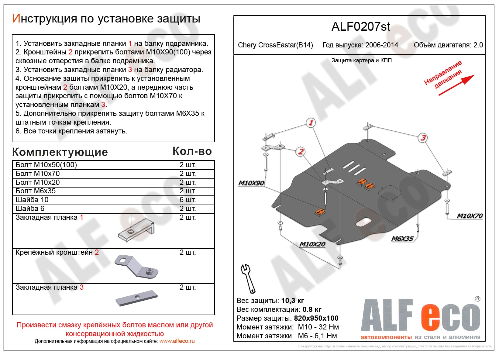 Защита картера и КПП ALFeco арт. ALF0207al изготовлена из алюминия толщиной 4мм специально для автомобиля Chery CrossEastar(B14) 2008-2013. Обеспечивает надежную защиту агрегатов от механических повреждений и попадания дорожной грязи и других предметов, встречающихся на проезжей части, способных зачастую нанести серьезный вред автомобилю. В комплекте идет весь необходимый крепеж для установки. Наличие можно уточнить по телефону. Возможна установка в нашем автосервисе по предварительной записи