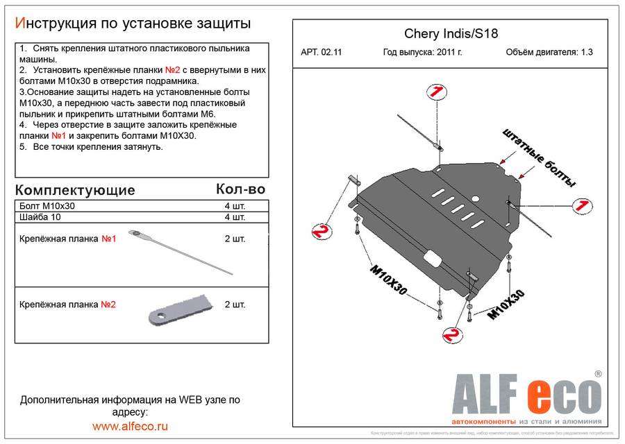 Защита картера и КПП ALFeco арт. ALF0211al изготовлена из алюминия толщиной 4мм специально для автомобиля Chery Indis (S18) 2011-2016. Обеспечивает надежную защиту агрегатов от механических повреждений и попадания дорожной грязи и других предметов, встречающихся на проезжей части, способных зачастую нанести серьезный вред автомобилю. В комплекте идет весь необходимый крепеж для установки. Наличие можно уточнить по телефону. Возможна установка в нашем автосервисе по предварительной записи