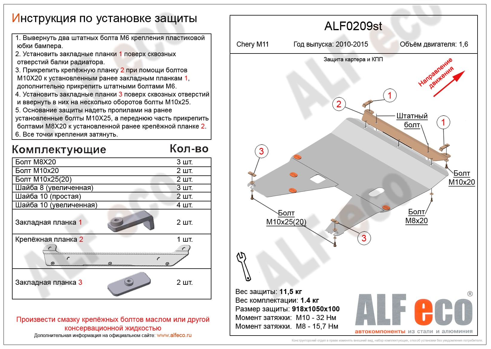 Защита картера и КПП ALFeco арт. ALF0209al изготовлена из алюминия толщиной 4мм специально для автомобиля Chery M11 2010-2016. Обеспечивает надежную защиту агрегатов от механических повреждений и попадания дорожной грязи и других предметов, встречающихся на проезжей части, способных зачастую нанести серьезный вред автомобилю. В комплекте идет весь необходимый крепеж для установки. Наличие можно уточнить по телефону. Возможна установка в нашем автосервисе по предварительной записи
