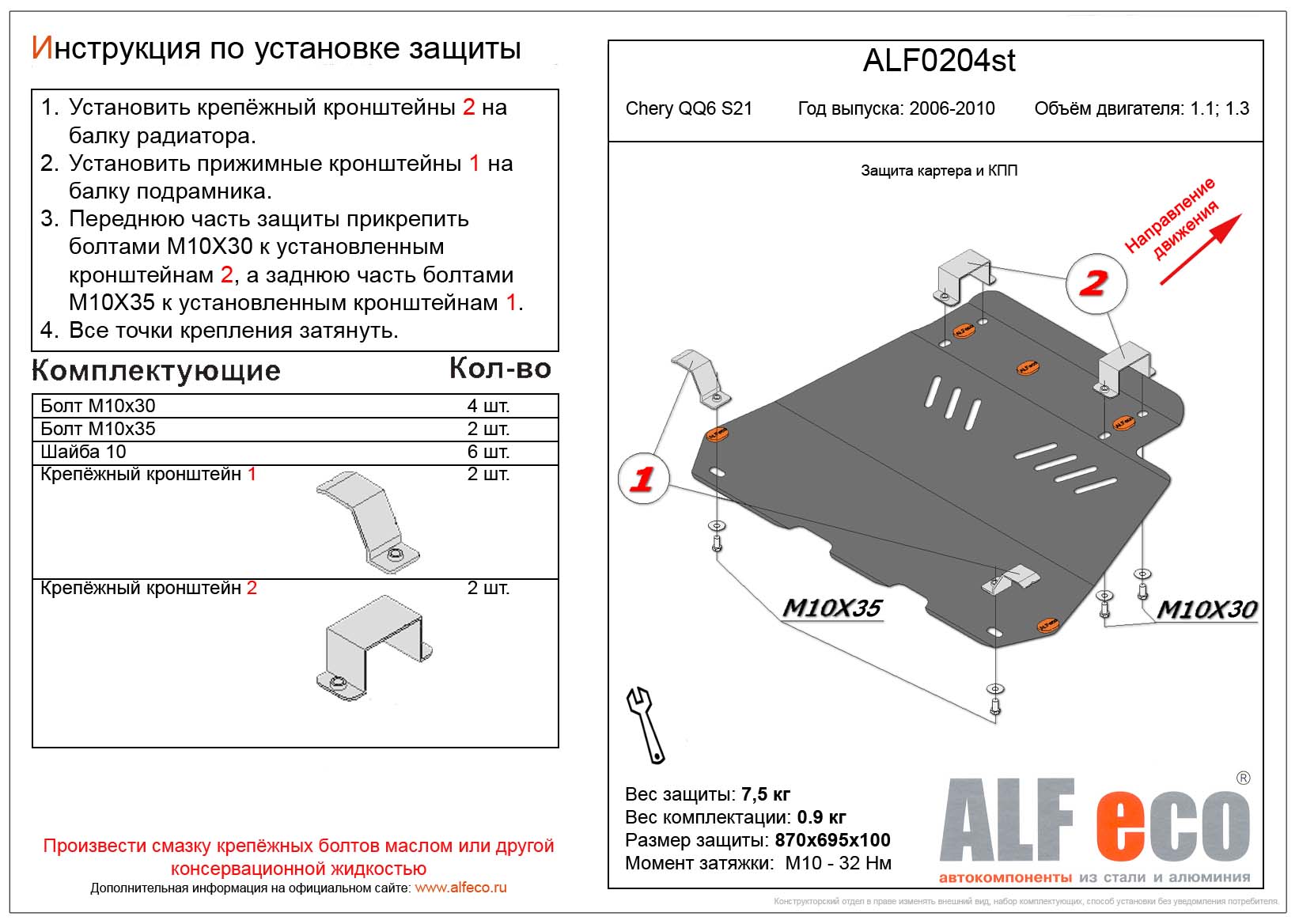 Защита картера и КПП ALFeco арт. ALF0204al изготовлена из алюминия толщиной 4мм специально для автомобиля Chery QQ6 S21 2006-2011. Обеспечивает надежную защиту агрегатов от механических повреждений и попадания дорожной грязи и других предметов, встречающихся на проезжей части, способных зачастую нанести серьезный вред автомобилю. В комплекте идет весь необходимый крепеж для установки. Наличие можно уточнить по телефону. Возможна установка в нашем автосервисе по предварительной записи
