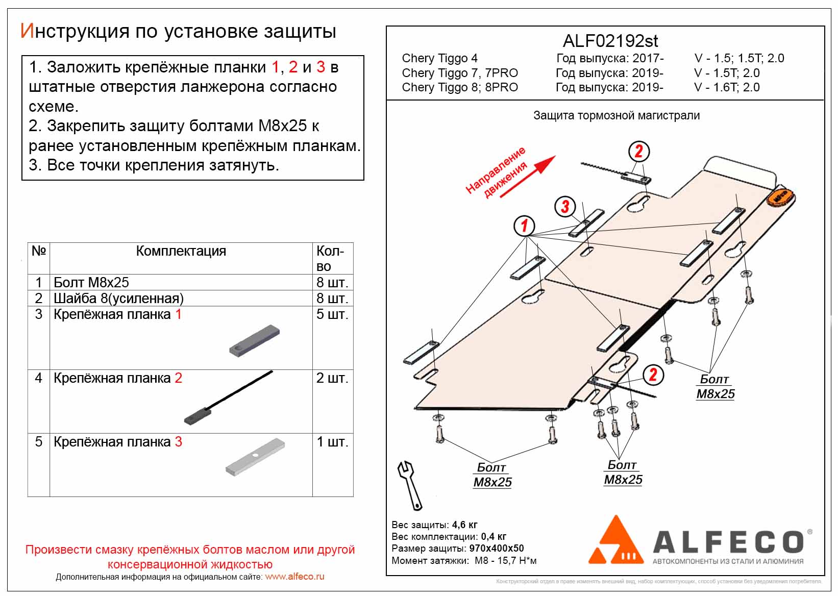 Защита тормозной магистрали ALFeco арт. ALF02192al изготовлена из алюминия толщиной 4мм специально для автомобиля Chery Tiggo 4 2017-. Обеспечивает надежную защиту агрегатов от механических повреждений и попадания дорожной грязи и других предметов, встречающихся на проезжей части, способных зачастую нанести серьезный вред автомобилю. В комплекте идет весь необходимый крепеж для установки. Наличие можно уточнить по телефону. Возможна установка в нашем автосервисе по предварительной записи