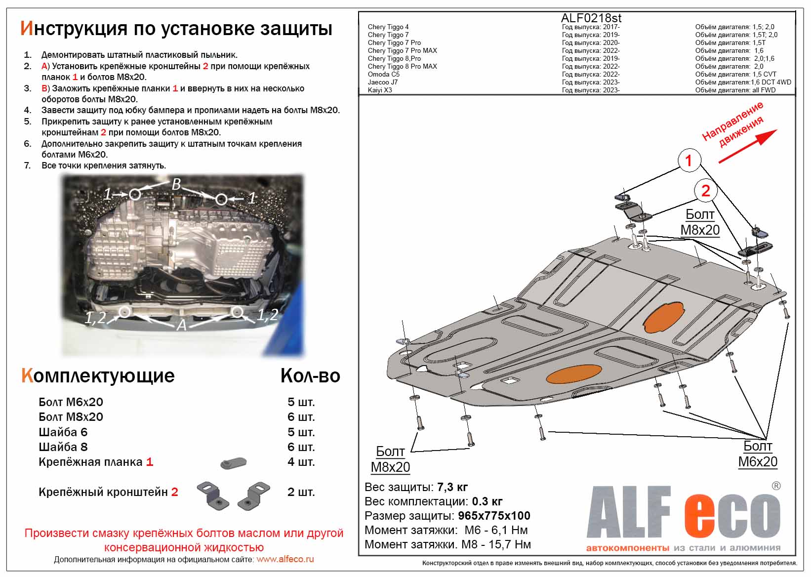 Защита картера и КПП (большая) ALFeco арт. ALF0218al-2 изготовлена из алюминия толщиной 4мм специально для автомобиля Chery Tiggo 7 Pro 2020-. Обеспечивает надежную защиту агрегатов от механических повреждений и попадания дорожной грязи и других предметов, встречающихся на проезжей части, способных зачастую нанести серьезный вред автомобилю. В комплекте идет весь необходимый крепеж для установки. Наличие можно уточнить по телефону. Возможна установка в нашем автосервисе по предварительной записи