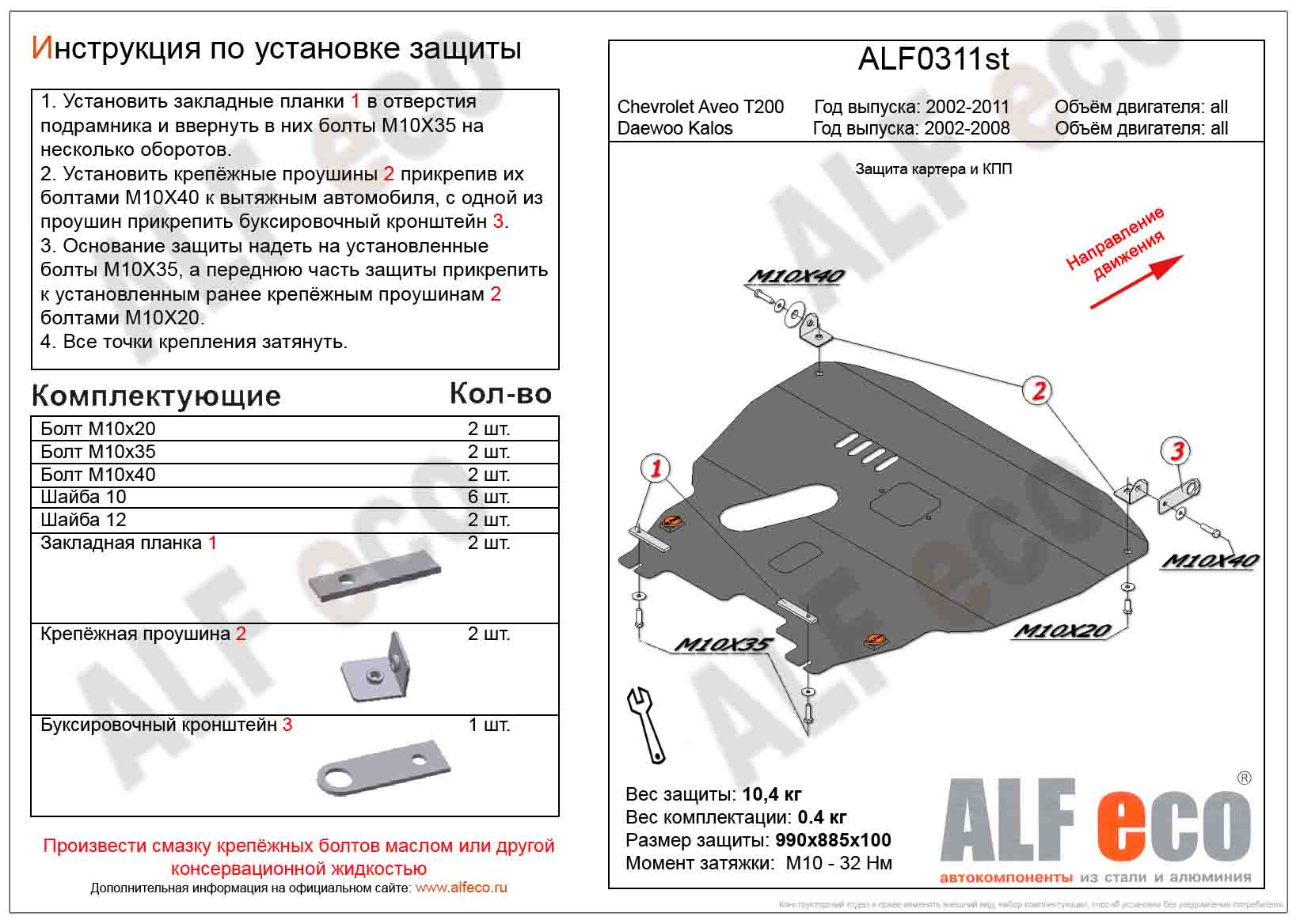 Защита картера и КПП ALFeco арт. ALF0311st изготовлена из стали толщиной 2мм специально для автомобиля Chevrolet Aveo T200 2002-2008. Обеспечивает надежную защиту агрегатов от механических повреждений и попадания дорожной грязи и других предметов, встречающихся на проезжей части, способных зачастую нанести серьезный вред автомобилю.