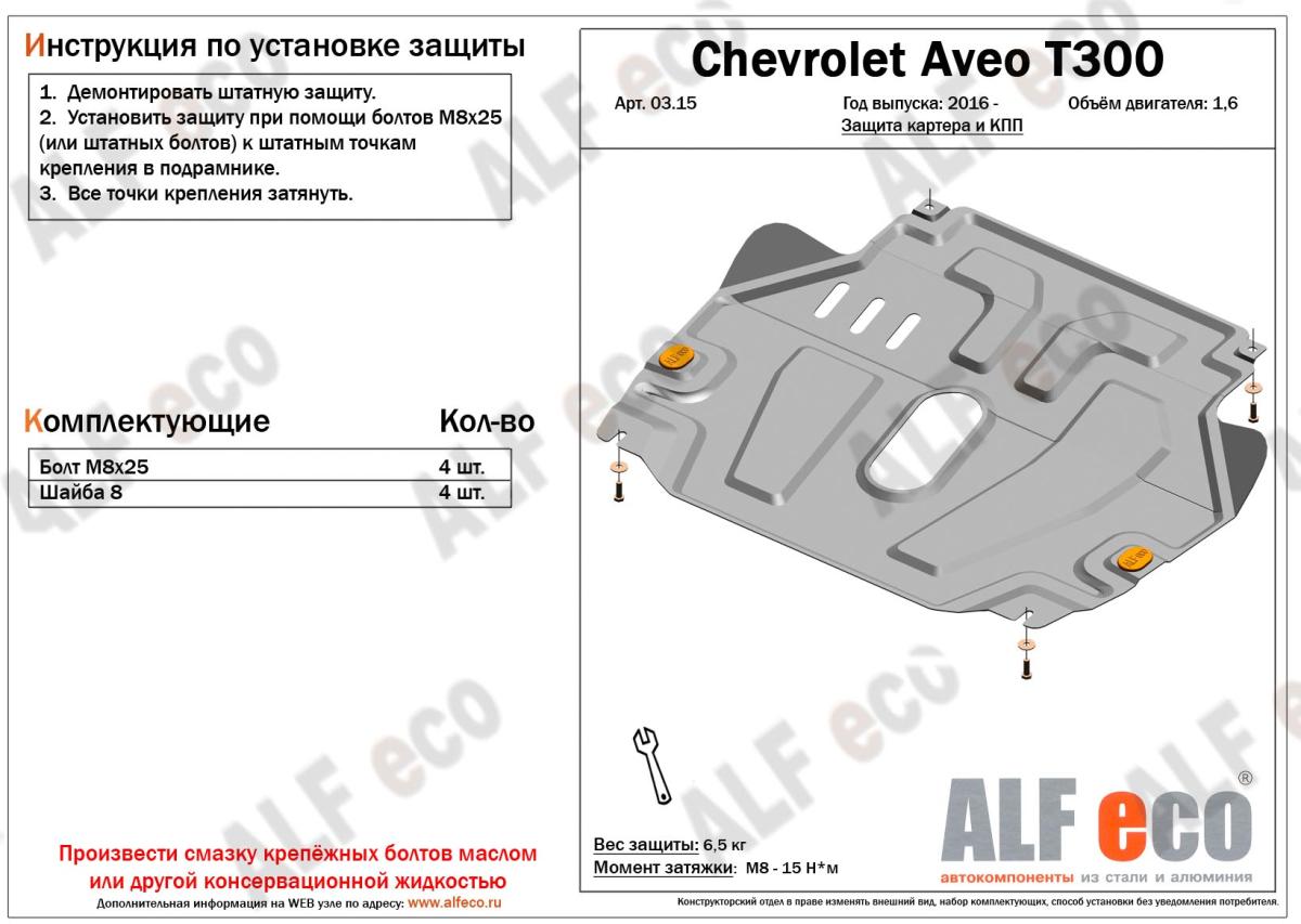Защита картера и КПП (03.15) Alfeco изготовлена из стали толщиной 2 мм, окрашеной итальянской порошковой эмалью Akzo Nobel, специально для автомобиля Chevrolet Aveo T300 (2012-). Данное изделие обеспечивает надежную защиту картера и КПП от механических воздействий, предохраняет подкапотное пространство от попадания грязи и пыли, а также способствует улучшению аэродинамики автомобиля за счет оптимизации обтекаемости моторного отсека снизу.