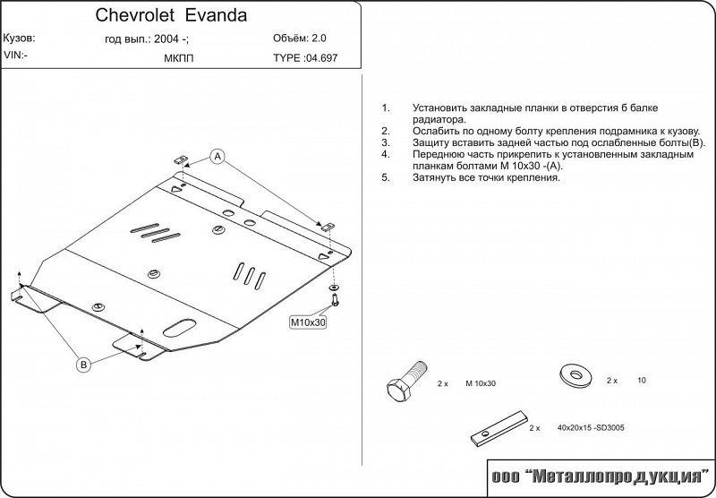 Стальная защита КПП Sheriff арт. 04.0697 толщиной 2 мм специально для автомобиля Chevrolet Evanda . Обеспечивает надежную защиту агрегатов от механических повреждений и попадания дорожной грязи и других предметов, встречающихся на проезжей части, способных зачастую нанести серьезный вред автомобилю. В комплекте идет весь необходимый крепеж для установки. Срок поставки защиты составляет 1-3 дня, наличие можно уточнить по телефону. Возможна установка в нашем автосервисе по предварительной записи