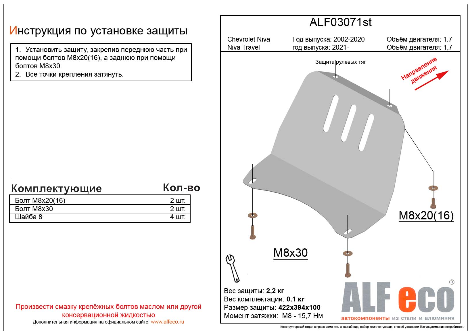 Защита рулевых тяг Chevrolet Niva 2002-2020 V-1,7 , ALFeco, алюминий 4мм, арт. ALF03071al