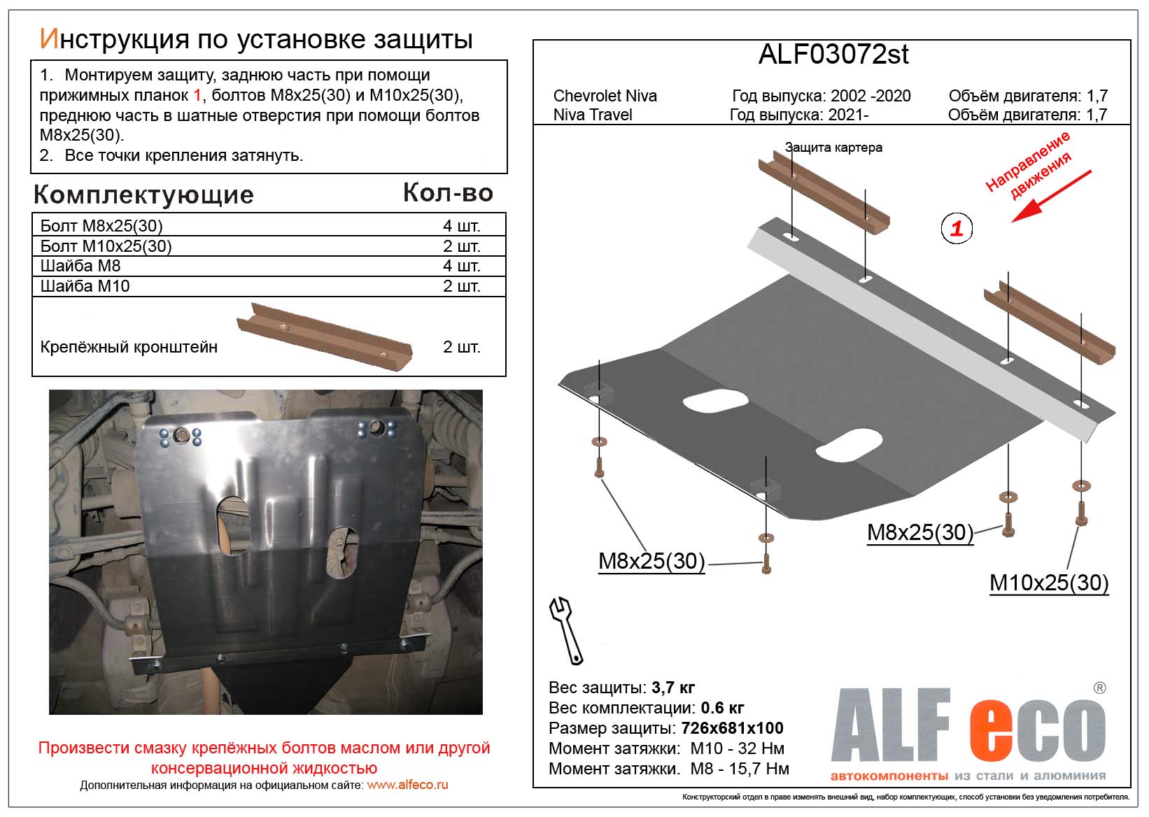 Защита картера Chevrolet Niva 2002-2020 V-1,7 , ALFeco, сталь 2мм, арт. ALF03072st