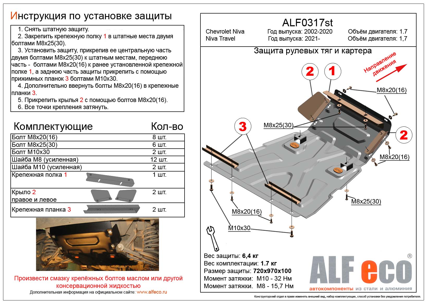 Защита рулевых тяг и картера ALFeco арт. ALF0317st изготовлена из стали толщиной 2мм специально для автомобиля Chevrolet Niva 2002-2020. Обеспечивает надежную защиту агрегатов от механических повреждений и попадания дорожной грязи и других предметов, встречающихся на проезжей части, способных зачастую нанести серьезный вред автомобилю. В комплекте идет весь необходимый крепеж для установки. Наличие можно уточнить по телефону. Возможна установка в нашем автосервисе по предварительной записи
