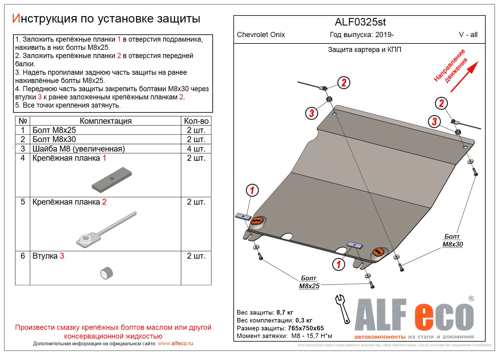 Защита картера и КПП ALFeco арт. ALF0325st изготовлена из стали толщиной 2мм специально для автомобиля Chevrolet Onix 2019-. Обеспечивает надежную защиту агрегатов от механических повреждений и попадания дорожной грязи и других предметов, встречающихся на проезжей части, способных зачастую нанести серьезный вред автомобилю. В комплекте идет весь необходимый крепеж для установки. Наличие можно уточнить по телефону. Возможна установка в нашем автосервисе по предварительной записи