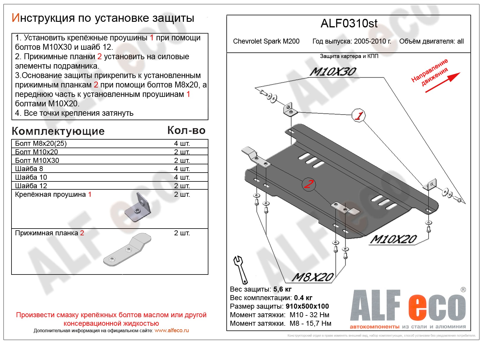 Защита картера и КПП ALFeco арт. ALF0310st изготовлена из стали толщиной 2мм специально для автомобиля Chevrolet Spark M200 2005-2010. Обеспечивает надежную защиту агрегатов от механических повреждений и попадания дорожной грязи и других предметов, встречающихся на проезжей части, способных зачастую нанести серьезный вред автомобилю. В комплекте идет весь необходимый крепеж для установки. Наличие можно уточнить по телефону. Возможна установка в нашем автосервисе по предварительной записи