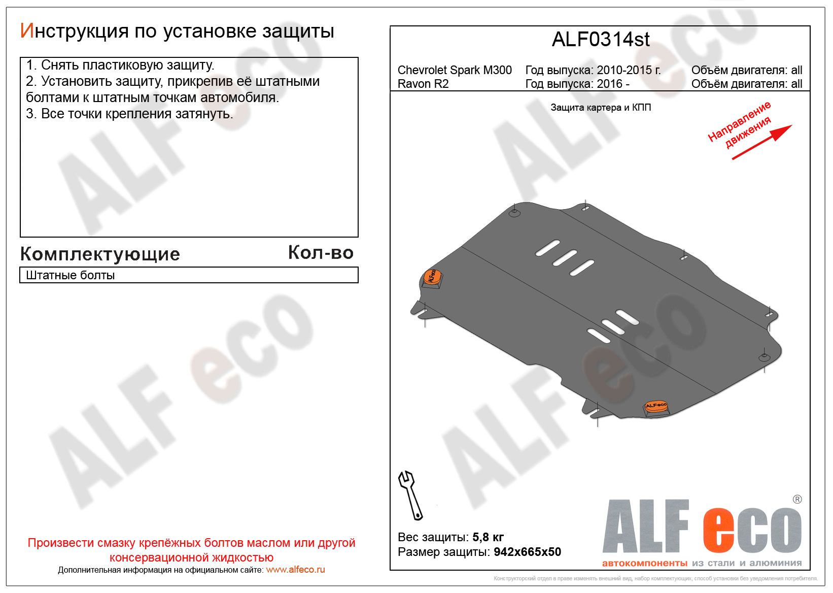Защита картера и КПП ALFeco арт. ALF0314al изготовлена из алюминия толщиной 4мм специально для автомобиля Chevrolet Spark M 300 2010-2015-. Обеспечивает надежную защиту агрегатов от механических повреждений и попадания дорожной грязи и других предметов, встречающихся на проезжей части, способных зачастую нанести серьезный вред автомобилю. В комплекте идет весь необходимый крепеж для установки. Наличие можно уточнить по телефону. Возможна установка в нашем автосервисе по предварительной записи