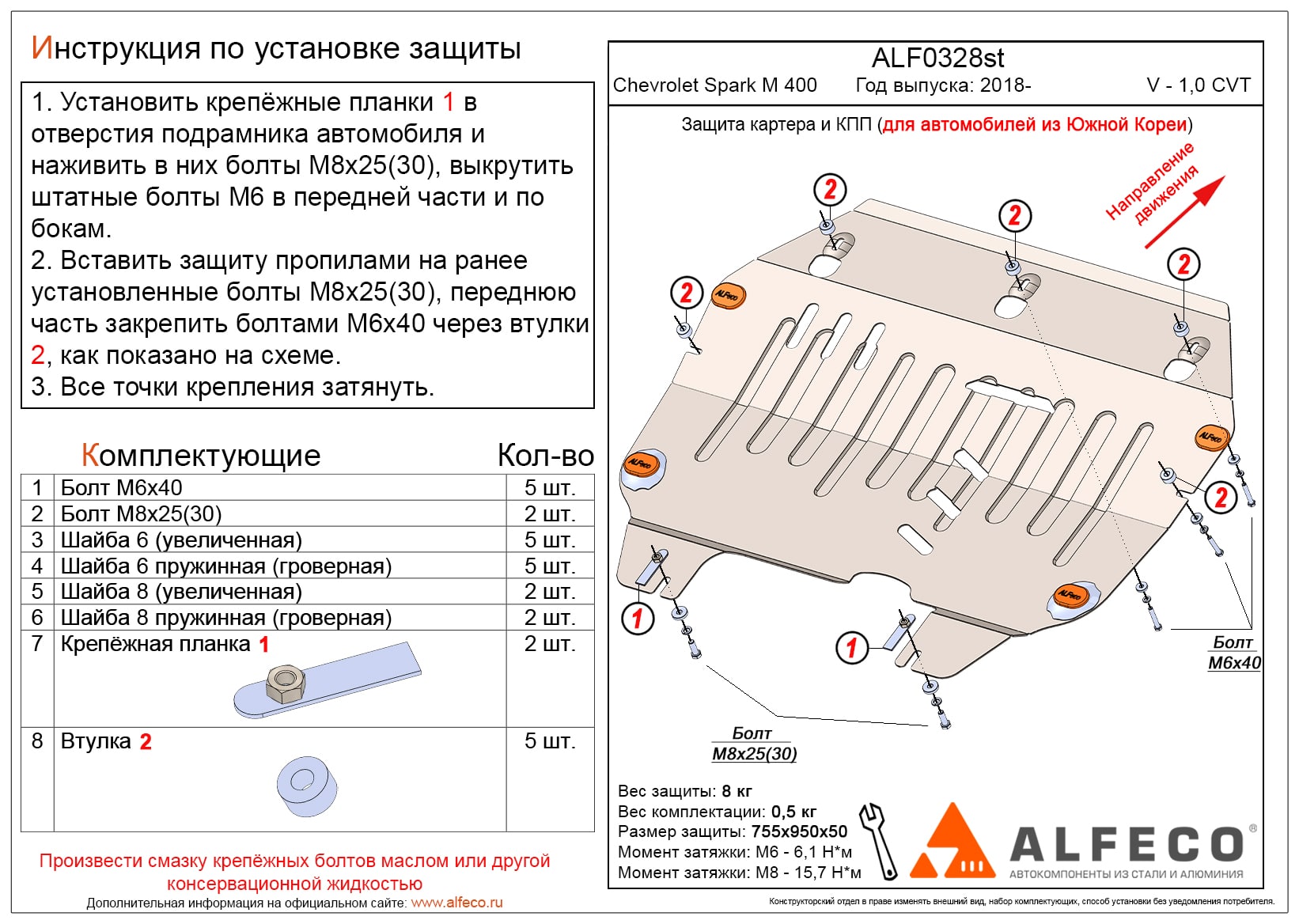 Защита картера и КПП ALFeco арт. ALF0328st изготовлена из стали толщиной 2 мм специально для автомобиля Chevrolet Spark M 400 2018- . Обеспечивает надежную защиту агрегатов от механических повреждений и попадания дорожной грязи и других предметов, встречающихся на проезжей части, способных зачастую нанести серьезный вред автомобилю. В комплекте идет весь необходимый крепеж для установки. Наличие можно уточнить по телефону. Возможна установка в нашем автосервисе по предварительной записи