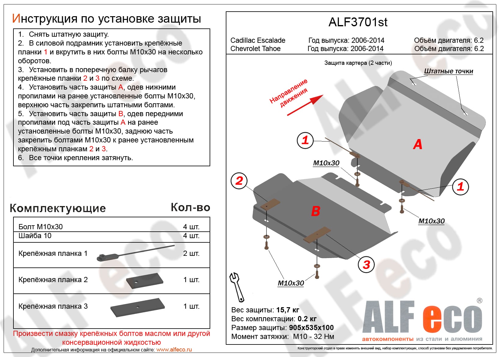 Защита картера (2 части) ALFeco арт. ALF3701st-1 изготовлена из стали толщиной 2мм специально для автомобиля Chevrolet Tahoe 2006-2014. Обеспечивает надежную защиту агрегатов от механических повреждений и попадания дорожной грязи и других предметов, встречающихся на проезжей части, способных зачастую нанести серьезный вред автомобилю. В комплекте идет весь необходимый крепеж для установки. Наличие можно уточнить по телефону. Возможна установка в нашем автосервисе по предварительной записи