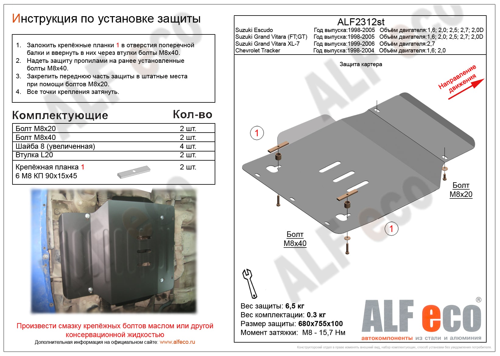 Защита картера ALFeco арт. ALF2312st-1 изготовлена из стали толщиной 2мм специально для автомобиля Chevrolet Tracker 1998-2004. Обеспечивает надежную защиту агрегатов от механических повреждений и попадания дорожной грязи и других предметов, встречающихся на проезжей части, способных зачастую нанести серьезный вред автомобилю. В комплекте идет весь необходимый крепеж для установки. Наличие можно уточнить по телефону. Возможна установка в нашем автосервисе по предварительной записи