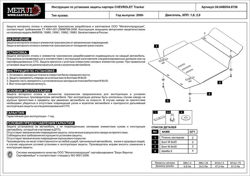 Приобретая стальную защиту 04.0480 для CHEVROLET Tracker 1998 - 2004, вы можете установить ее в нашем сервисе. Стоимость установки от 1100 рублей за лист, предварительно необходимо записаться по телефону на удобное для вас время.