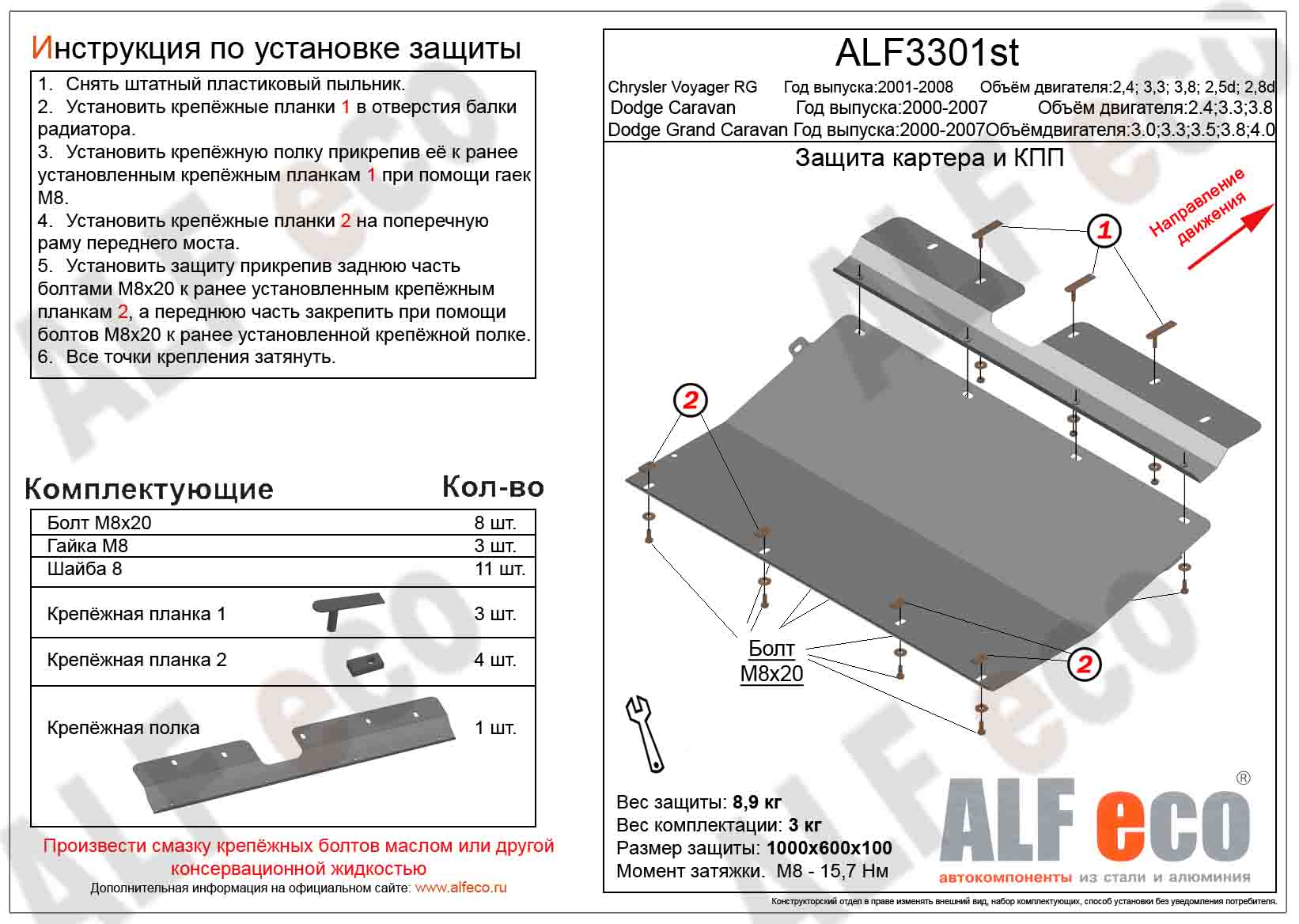 Защита картера и КПП ALFeco арт. ALF3301st изготовлена из стали толщиной 2мм специально для автомобиля Chrysler Voyager RG 2001-2008. Обеспечивает надежную защиту агрегатов от механических повреждений и попадания дорожной грязи и других предметов, встречающихся на проезжей части, способных зачастую нанести серьезный вред автомобилю. В комплекте идет весь необходимый крепеж для установки. Наличие можно уточнить по телефону. Возможна установка в нашем автосервисе по предварительной записи