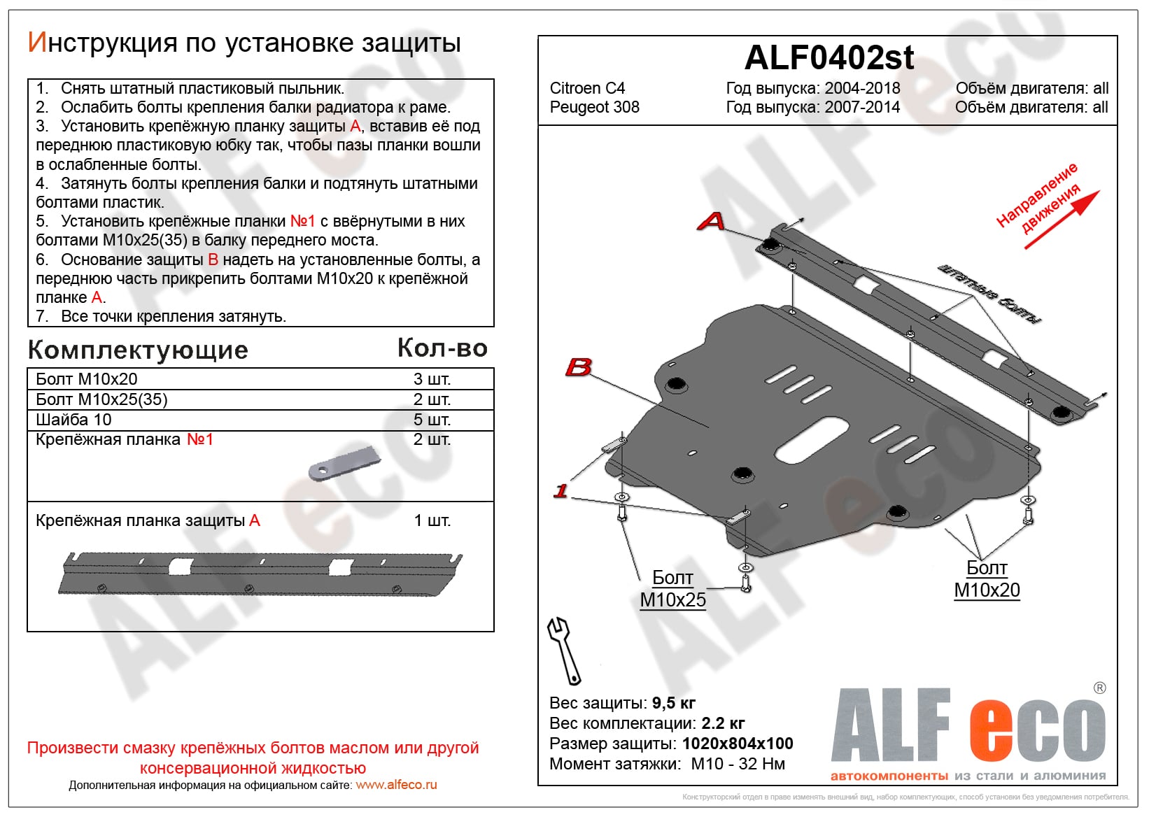 Защита картера и КПП ALFeco арт. ALF0402al изготовлена из алюминия толщиной 4мм специально для автомобиля Citroen C4 2004-2008-2018. Обеспечивает надежную защиту агрегатов от механических повреждений и попадания дорожной грязи и других предметов, встречающихся на проезжей части, способных зачастую нанести серьезный вред автомобилю. В комплекте идет весь необходимый крепеж для установки. Наличие можно уточнить по телефону. Возможна установка в нашем автосервисе по предварительной записи