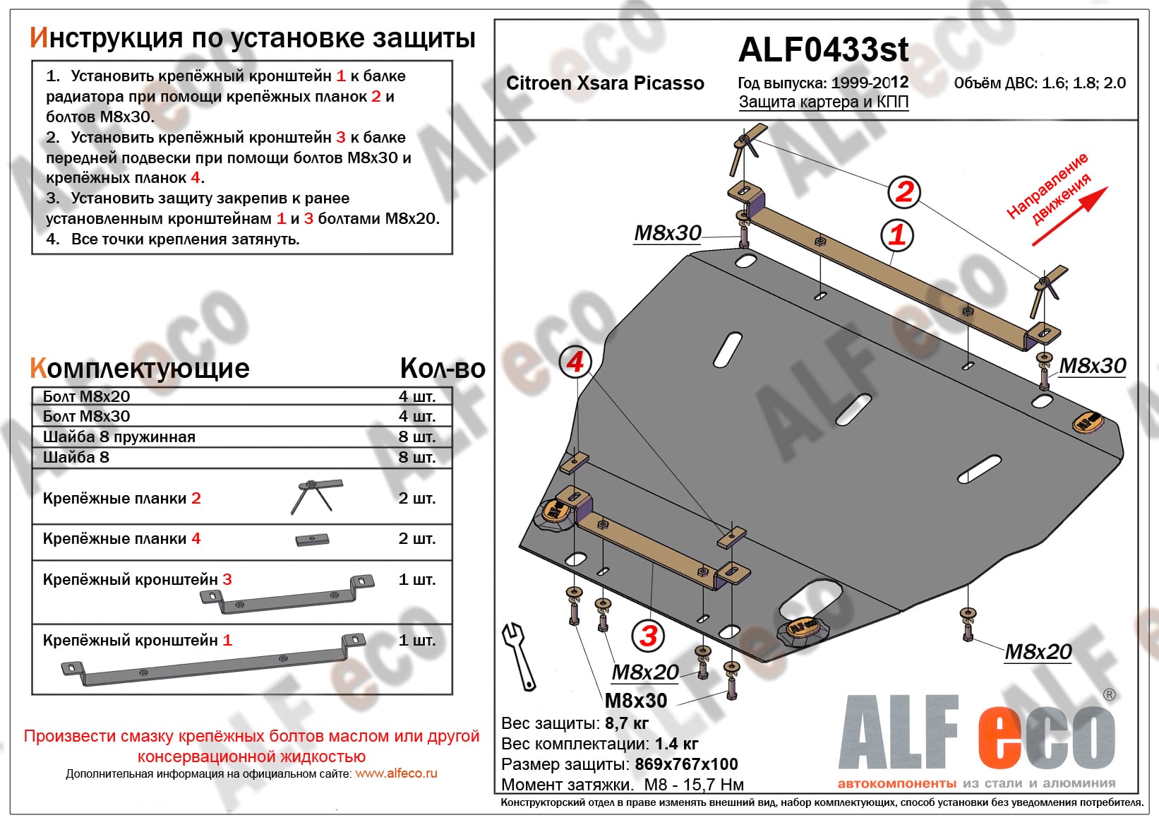 Защита картера и КПП ALFeco арт. ALF0433al изготовлена из алюминия толщиной 4мм специально для автомобиля Citroen Xsara Picasso 1999-2008. Обеспечивает надежную защиту агрегатов от механических повреждений и попадания дорожной грязи и других предметов, встречающихся на проезжей части, способных зачастую нанести серьезный вред автомобилю. В комплекте идет весь необходимый крепеж для установки. Наличие можно уточнить по телефону. Возможна установка в нашем автосервисе по предварительной записи