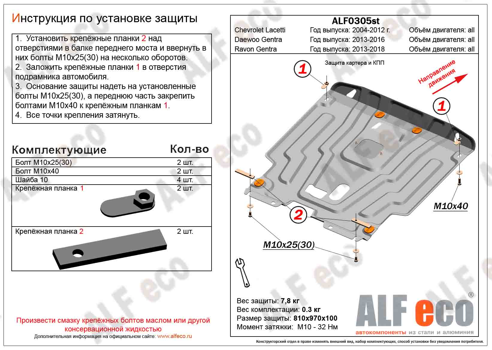 Защита картера и КПП ALFeco арт. ALF0305st-1 изготовлена из стали толщиной 2мм специально для автомобиля Daewoo Gentra 2013-2016. Обеспечивает надежную защиту агрегатов от механических повреждений и попадания дорожной грязи и других предметов, встречающихся на проезжей части, способных зачастую нанести серьезный вред автомобилю. В комплекте идет весь необходимый крепеж для установки. Наличие можно уточнить по телефону. Возможна установка в нашем автосервисе по предварительной записи