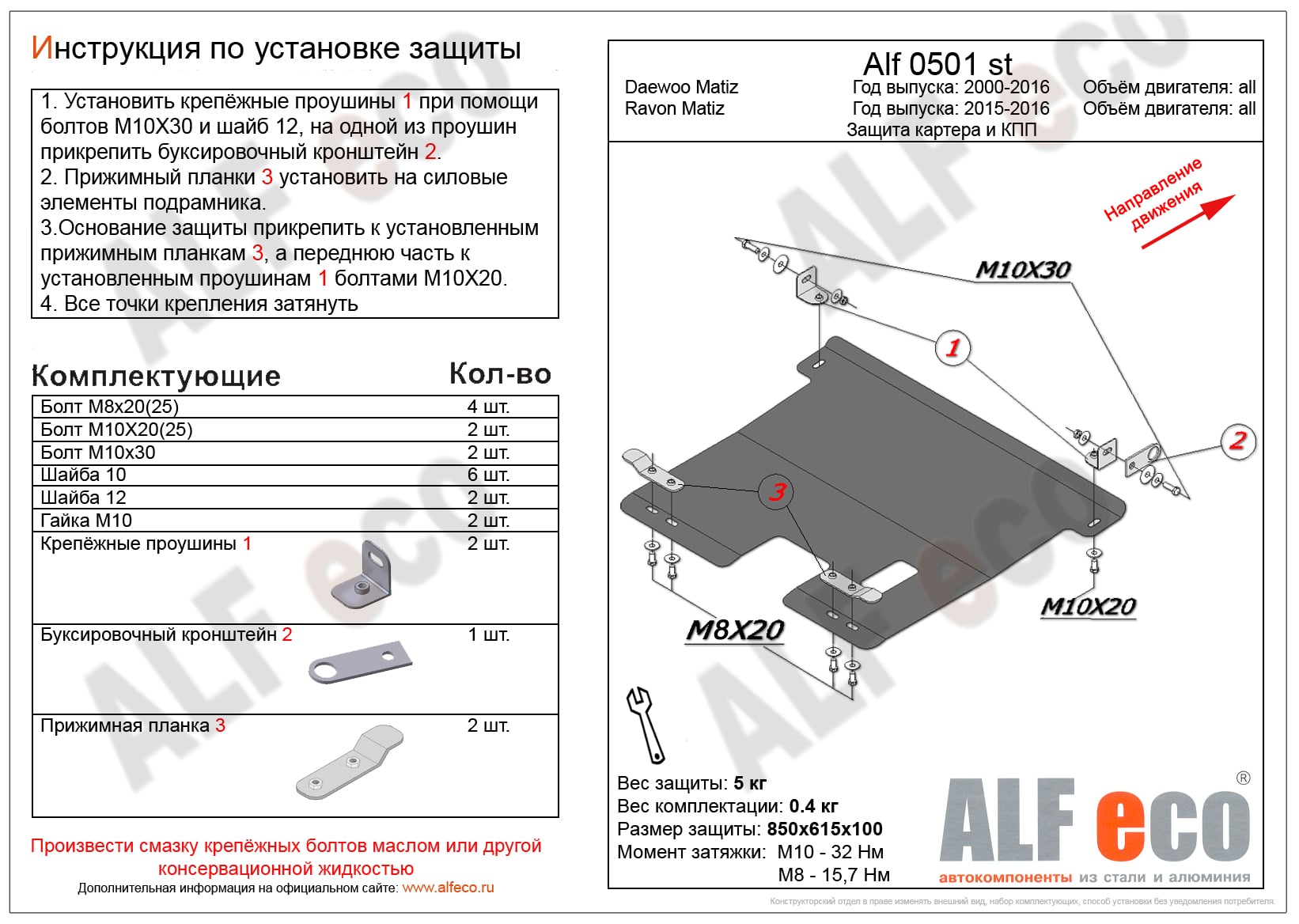 Защита картера и КПП ALFeco арт. ALF0501st изготовлена из стали толщиной 1.5мм специально для автомобиля Daewoo Matiz 2000-2016. Обеспечивает надежную защиту агрегатов от механических повреждений и попадания дорожной грязи и других предметов, встречающихся на проезжей части, способных зачастую нанести серьезный вред автомобилю. В комплекте идет весь необходимый крепеж для установки. Наличие можно уточнить по телефону. Возможна установка в нашем автосервисе по предварительной записи