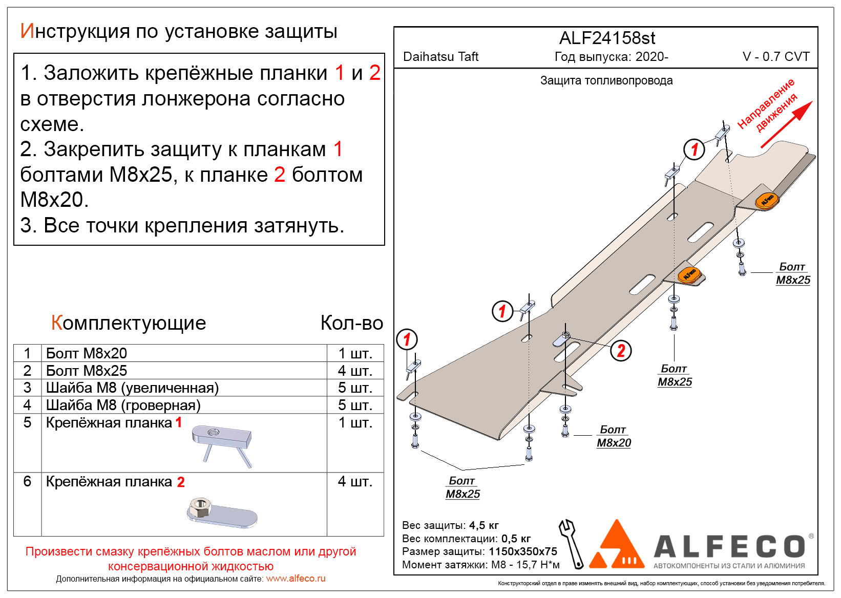 Защита топливопровода ALFeco арт. ALF24158al изготовлена из алюминия толщиной 4 мм специально для автомобиля Daihatsu Taft 2020- . Обеспечивает надежную защиту агрегатов от механических повреждений и попадания дорожной грязи и других предметов, встречающихся на проезжей части, способных зачастую нанести серьезный вред автомобилю. В комплекте идет весь необходимый крепеж для установки. Наличие можно уточнить по телефону. Возможна установка в нашем автосервисе по предварительной записи