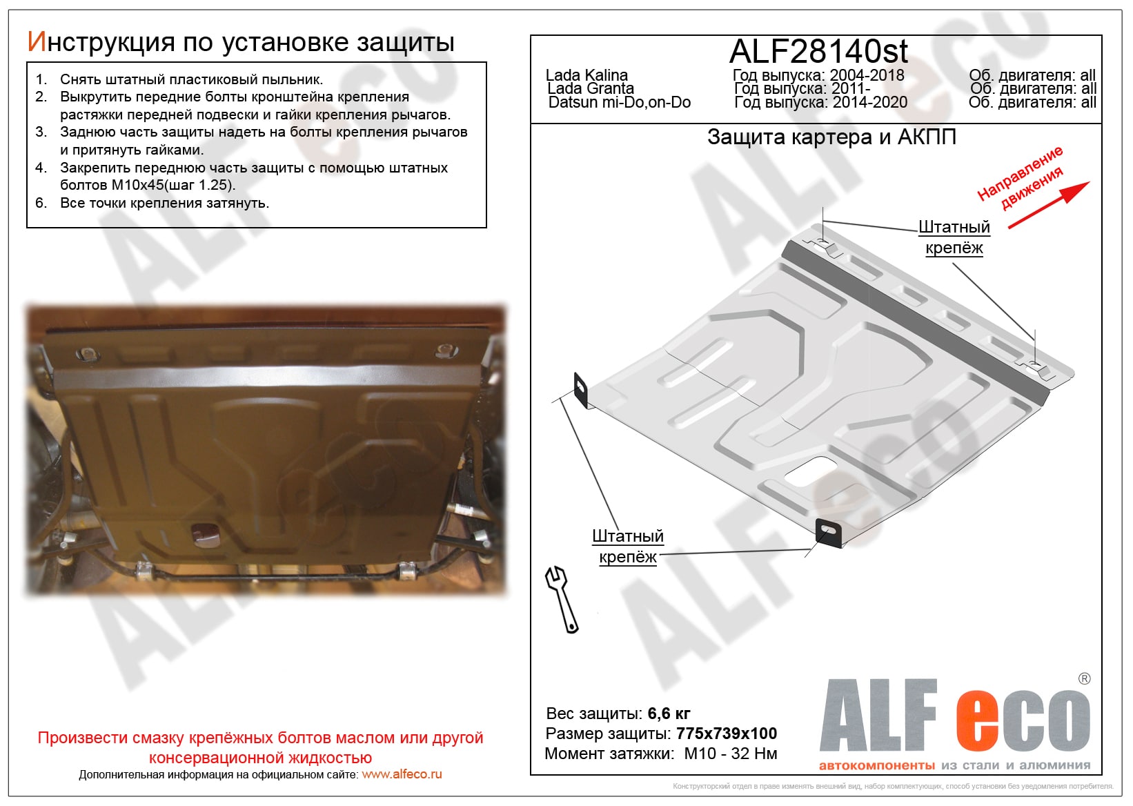 Защита картера и КПП ALFeco арт. ALF28140st-2 изготовлена из стали толщиной 1.5мм специально для автомобиля Datsun mi-Do 2014-. Обеспечивает надежную защиту агрегатов от механических повреждений и попадания дорожной грязи и других предметов, встречающихся на проезжей части, способных зачастую нанести серьезный вред автомобилю. В комплекте идет весь необходимый крепеж для установки. Наличие можно уточнить по телефону. Возможна установка в нашем автосервисе по предварительной записи