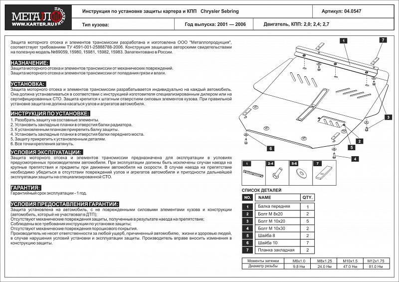 Приобретая стальную защиту 04.0547 для DODGE Stratus 2001 - 2006, вы можете установить ее в нашем сервисе. Стоимость установки от 1100 рублей за лист, предварительно необходимо записаться по телефону на удобное для вас время.