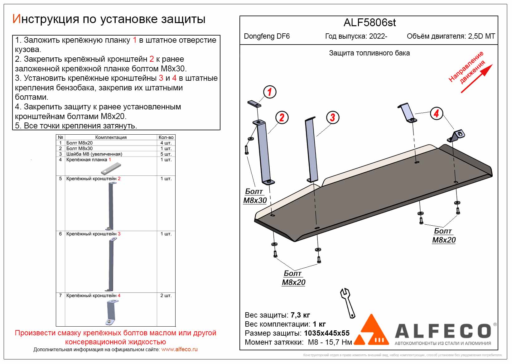 Защита топливного бака ALFeco арт. ALF5806st изготовлена из стали толщиной 2мм специально для автомобиля Dongfeng DF6 2022-. Обеспечивает надежную защиту агрегатов от механических повреждений и попадания дорожной грязи и других предметов, встречающихся на проезжей части, способных зачастую нанести серьезный вред автомобилю. В комплекте идет весь необходимый крепеж для установки. Наличие можно уточнить по телефону. Возможна установка в нашем автосервисе по предварительной записи