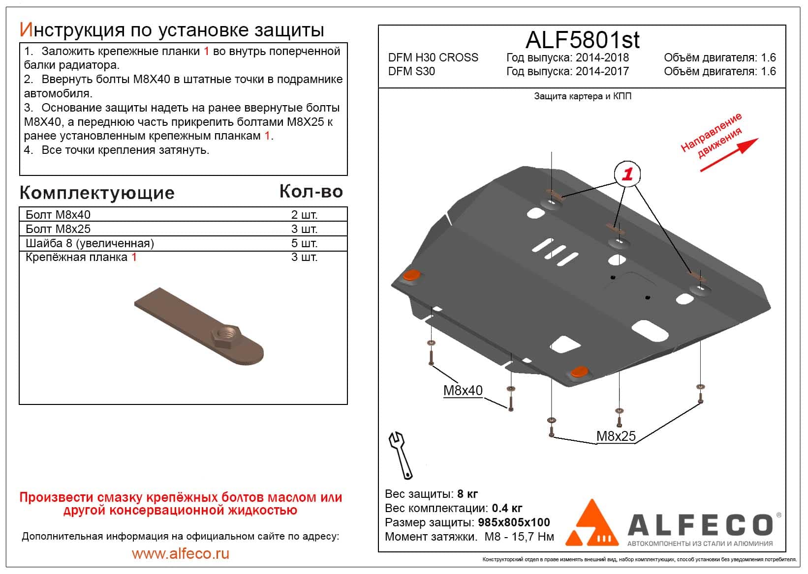 Защита картера и КПП ALFeco арт. ALF5801al изготовлена из алюминия толщиной 4мм специально для автомобиля Dongfeng H30 CROSS 2014-2018. Обеспечивает надежную защиту агрегатов от механических повреждений и попадания дорожной грязи и других предметов, встречающихся на проезжей части, способных зачастую нанести серьезный вред автомобилю. В комплекте идет весь необходимый крепеж для установки. Наличие можно уточнить по телефону. Возможна установка в нашем автосервисе по предварительной записи