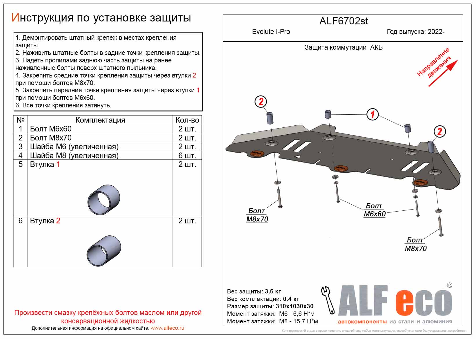 Защита коммутации АКБ ALFeco арт. ALF6702al изготовлена из алюминия толщиной 4мм специально для автомобиля Evolute I-Pro 2022- защита коммутации АКБ. Обеспечивает надежную защиту агрегатов от механических повреждений и попадания дорожной грязи и других предметов, встречающихся на проезжей части, способных зачастую нанести серьезный вред автомобилю. В комплекте идет весь необходимый крепеж для установки. Наличие можно уточнить по телефону. Возможна установка в нашем автосервисе по предварительной записи