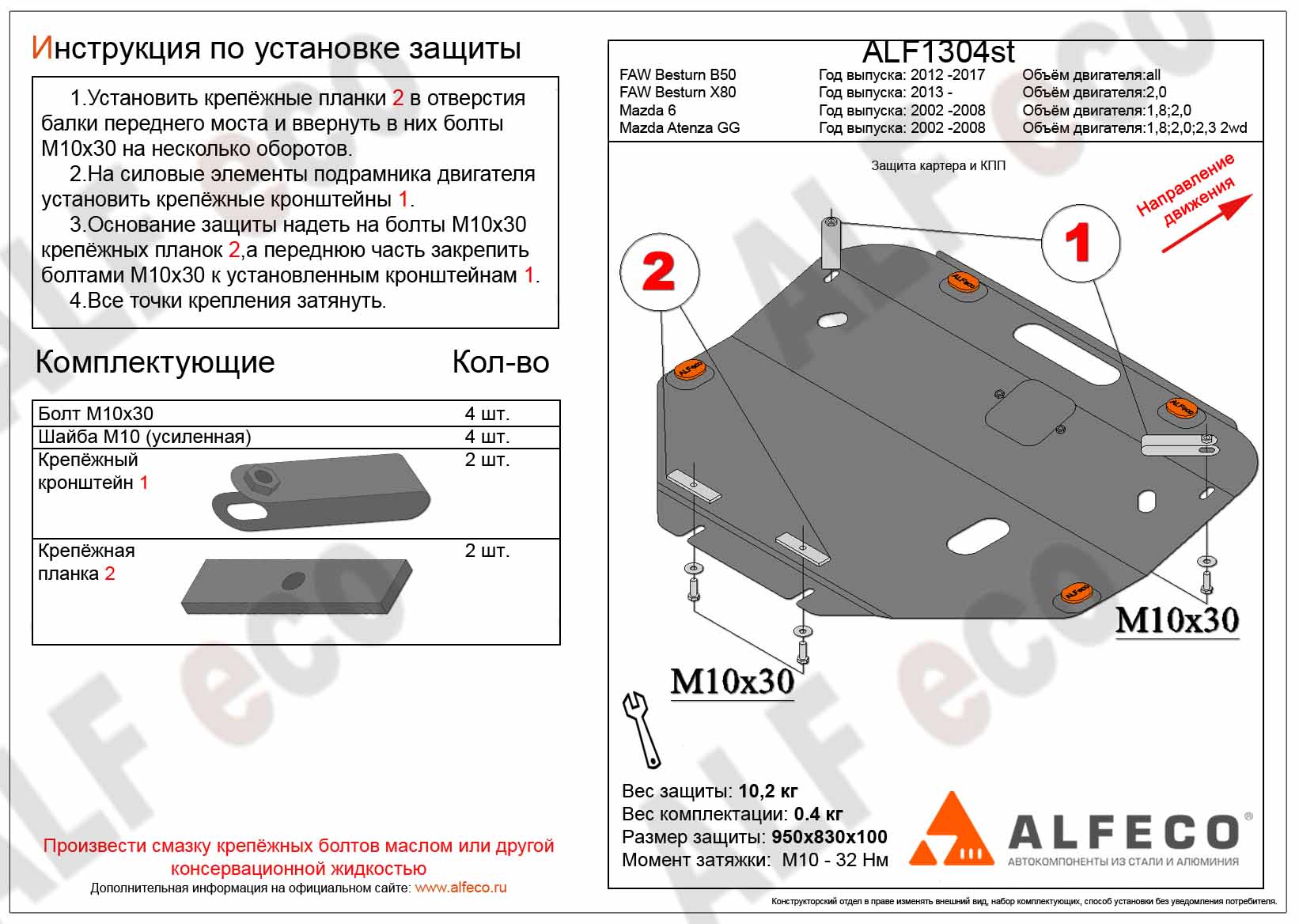 Защита картера и КПП ALFeco арт. ALF1304al-2 изготовлена из алюминия толщиной 4мм специально для автомобиля FAW Besturn B50 2012-2017. Обеспечивает надежную защиту агрегатов от механических повреждений и попадания дорожной грязи и других предметов, встречающихся на проезжей части, способных зачастую нанести серьезный вред автомобилю. В комплекте идет весь необходимый крепеж для установки. Наличие можно уточнить по телефону. Возможна установка в нашем автосервисе по предварительной записи