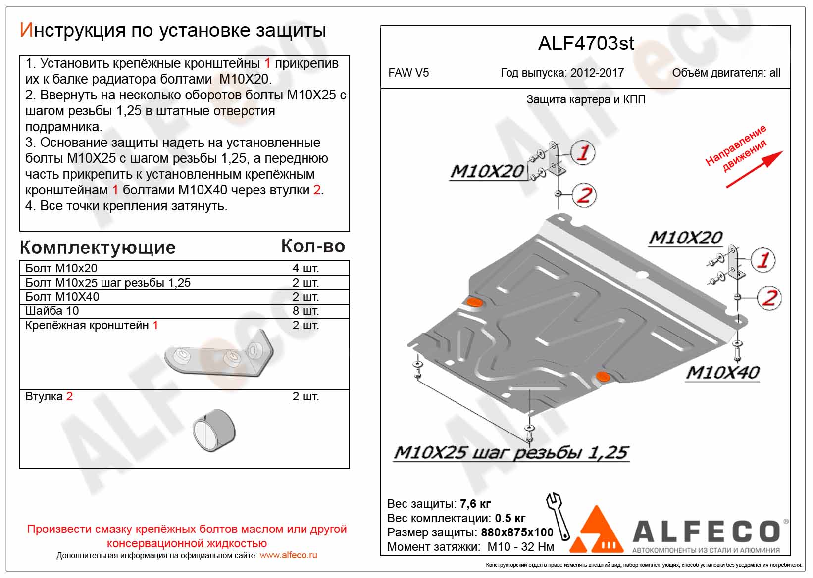 Защита картера и КПП ALFeco арт. ALF4703al изготовлена из алюминия толщиной 4мм специально для автомобиля FAW V5 2012-2017. Обеспечивает надежную защиту агрегатов от механических повреждений и попадания дорожной грязи и других предметов, встречающихся на проезжей части, способных зачастую нанести серьезный вред автомобилю. В комплекте идет весь необходимый крепеж для установки. Наличие можно уточнить по телефону. Возможна установка в нашем автосервисе по предварительной записи